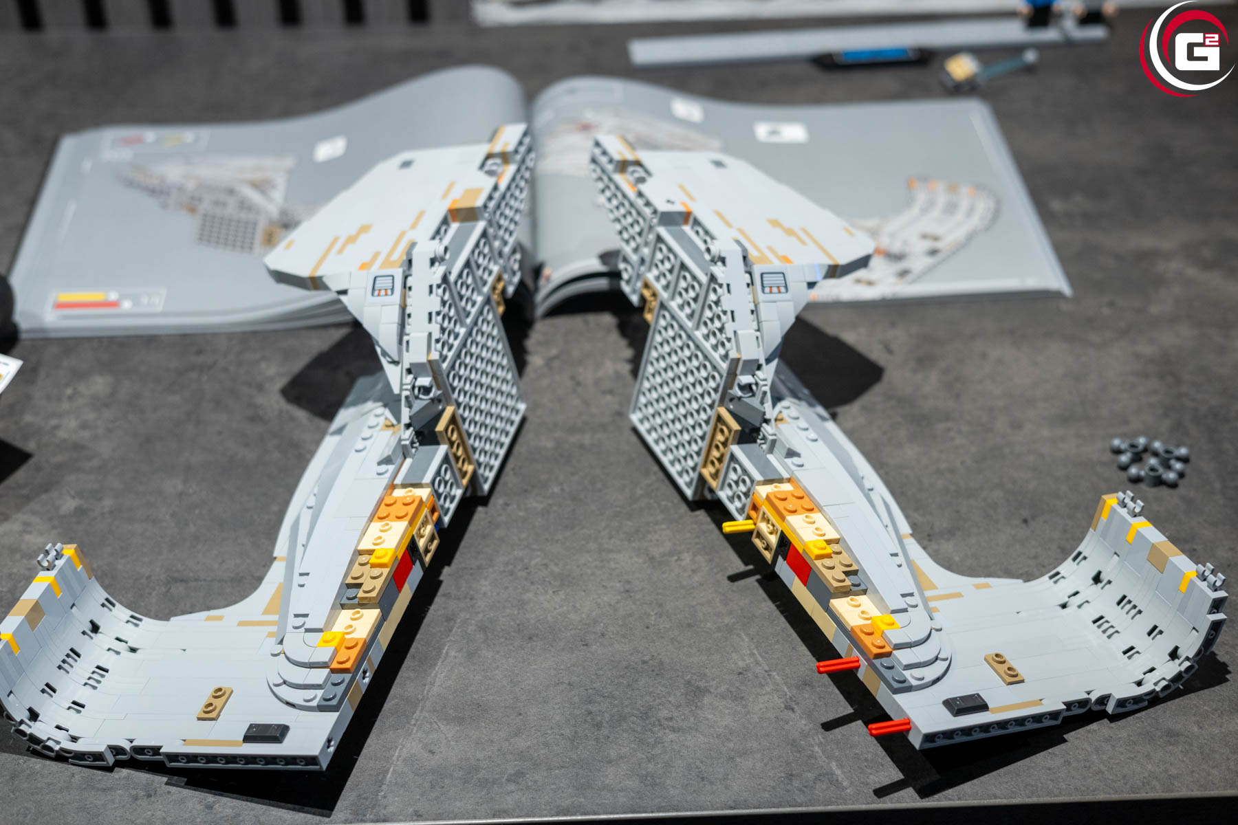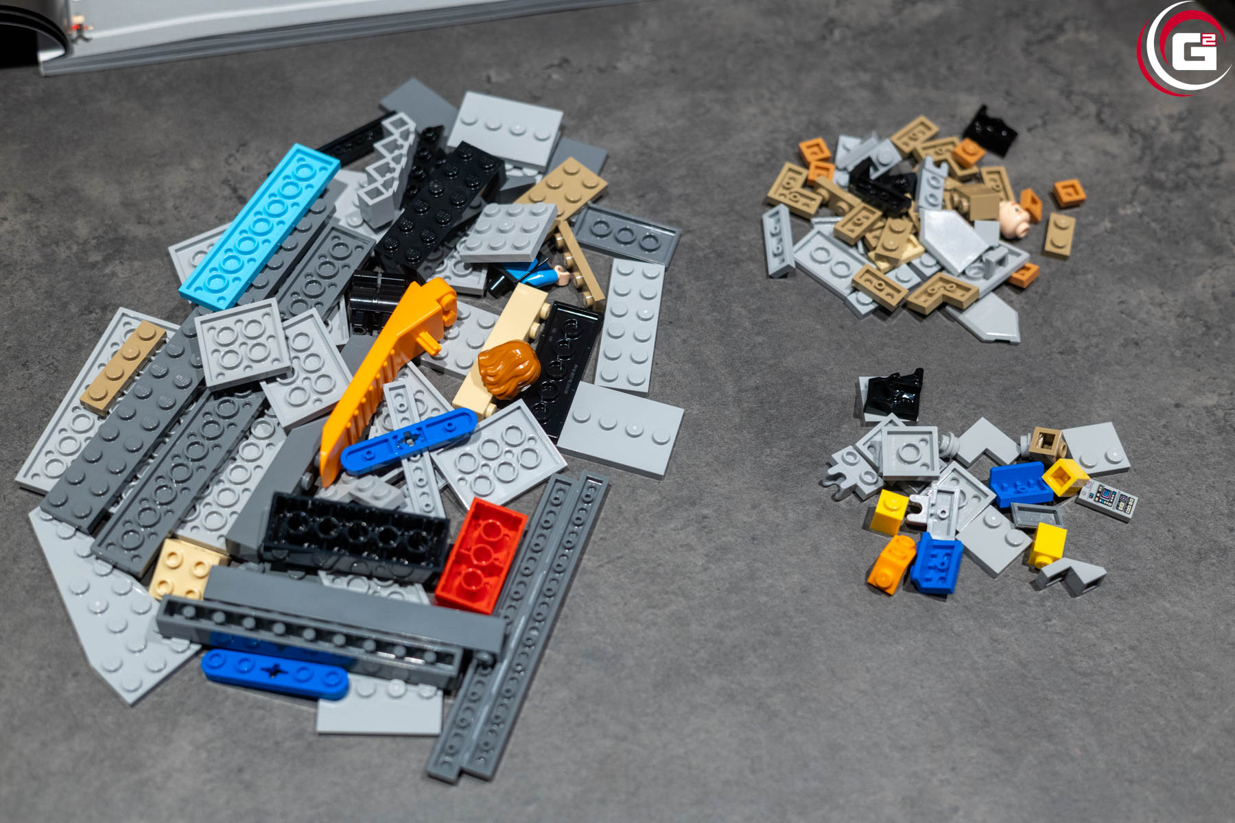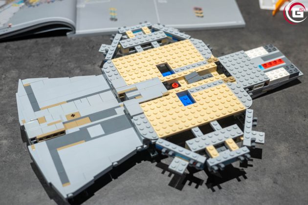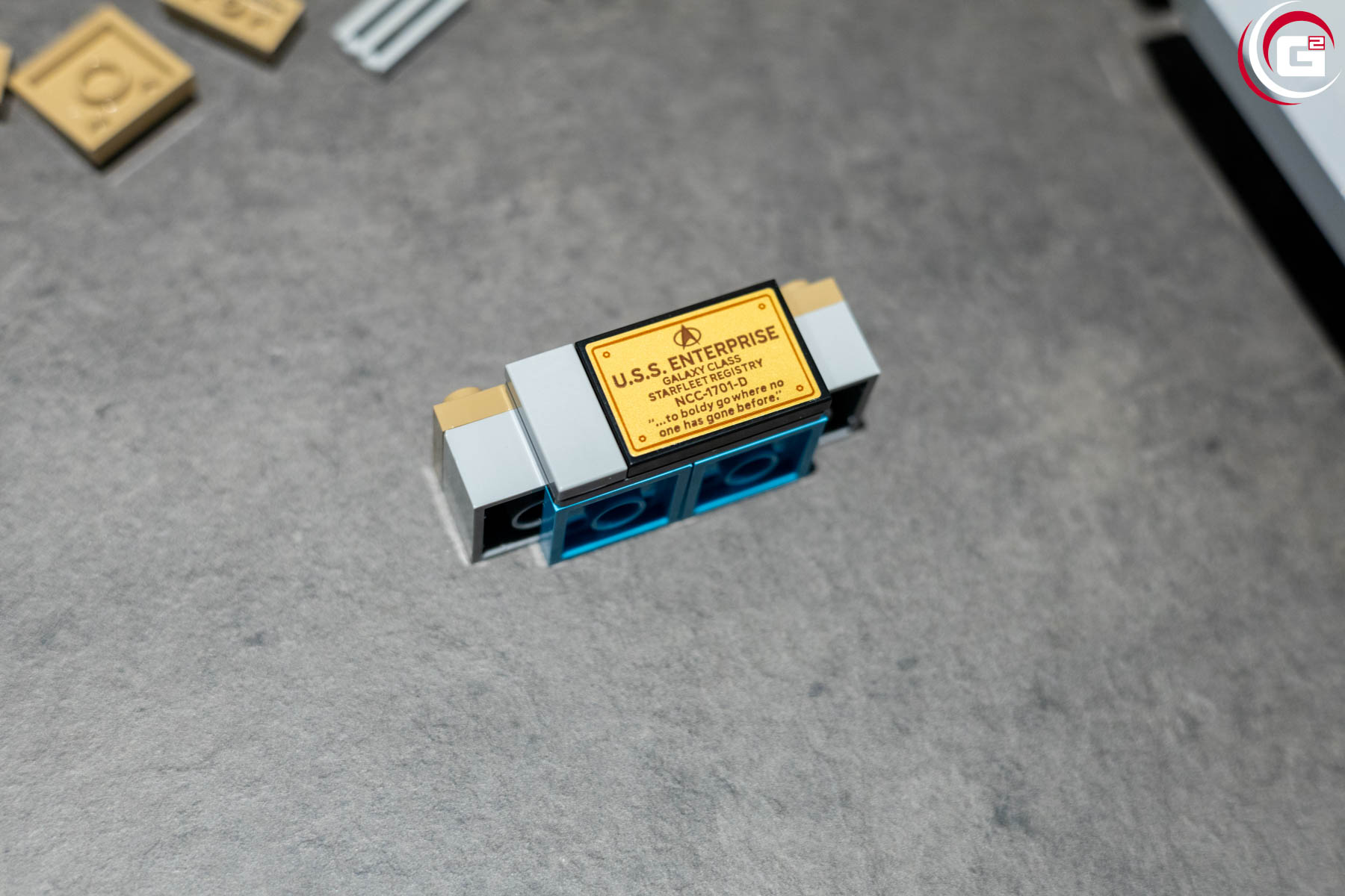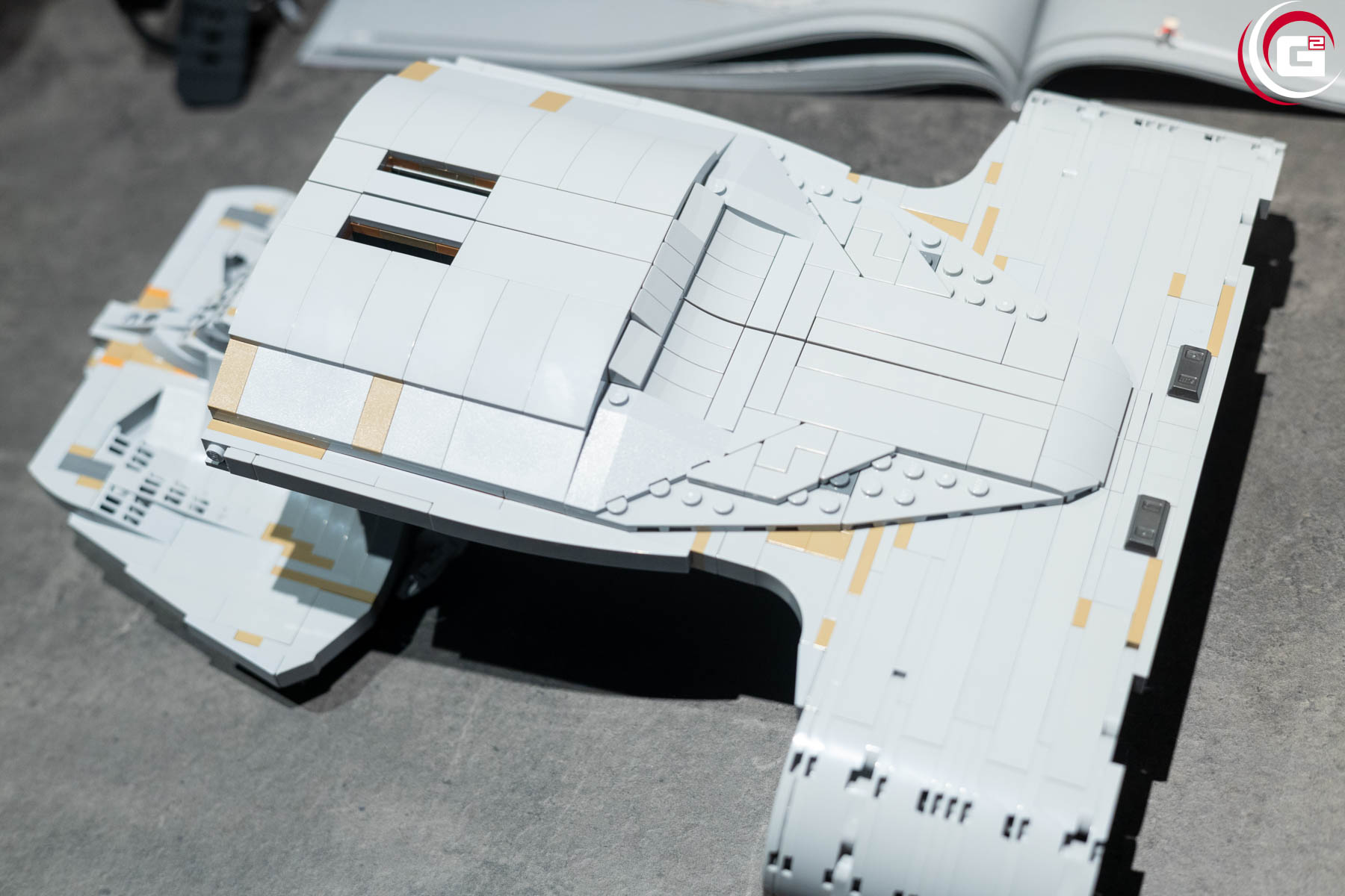 Wie man es von LEGO kennt, sind die Qualität der Bausteine und die Passgenauigkeit hervorragend, auch die Farbgebung ist homogen. Gestaltung und Detaillierung sind hier auf einem extrem hohen Niveau angesiedelt. Es kommen sehr viele bedruckte Teile zum Einsatz, insbesondere an den besonders markanten Stellen. Es gibt jedoch auch einige Sticker, die man ruhig durch weitere bedruckte Teile hätte ersetzen können. Durch seine Größe besitzt das Modell natürlich ein durchaus beeindruckendes Gewicht. Dank der extrem stabilen Konstruktion stellt dies kein Problem dar und auch der Modellständer ist so konzipiert, dass er das Modell stets stabil hält. Hierbei wurde auch berücksichtigt, dass das Modell nicht das Gleichgewicht verlieren darf, wenn man die Untertassensektion abnimmt. Zum Tragen wird in der Anleitung darauf hingewiesen, wie man das Modell am besten greifen kann, ohne etwas zu beschädigen.