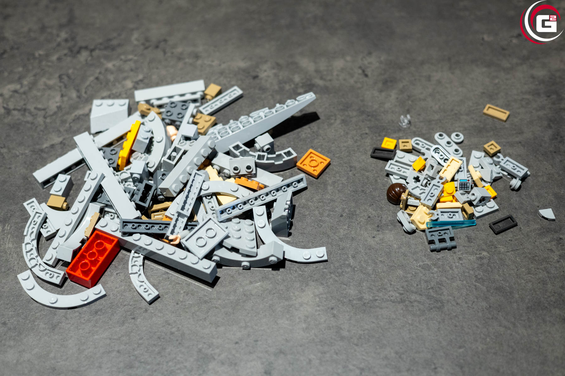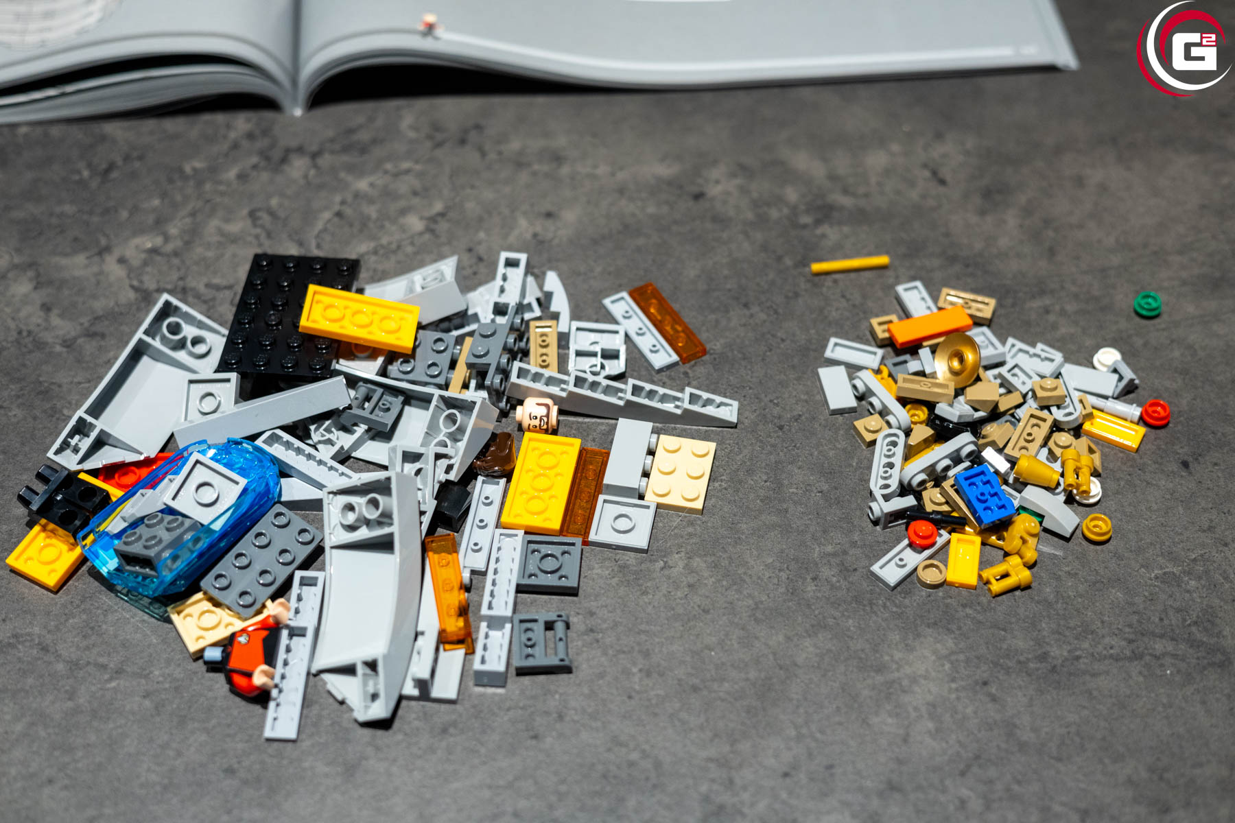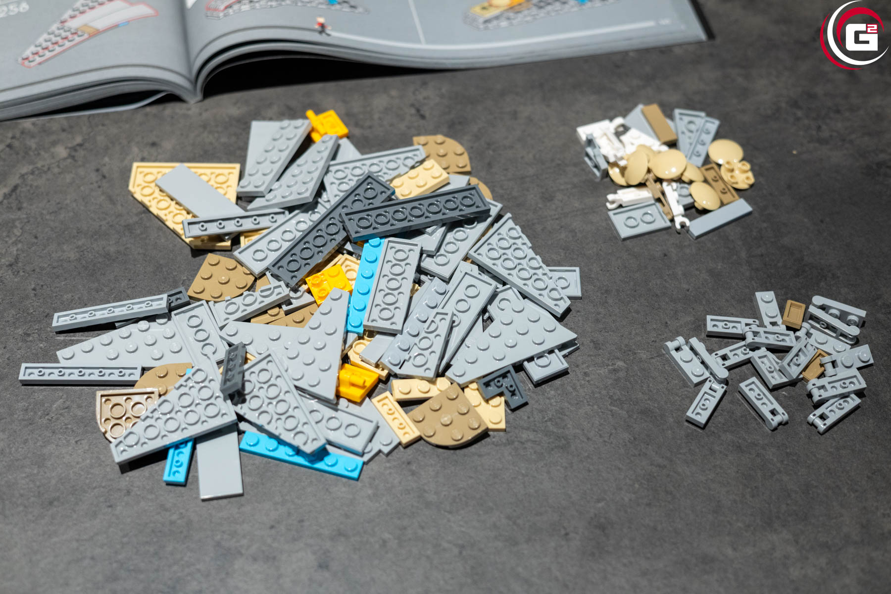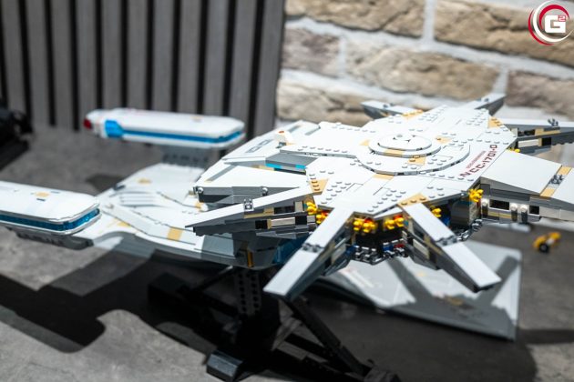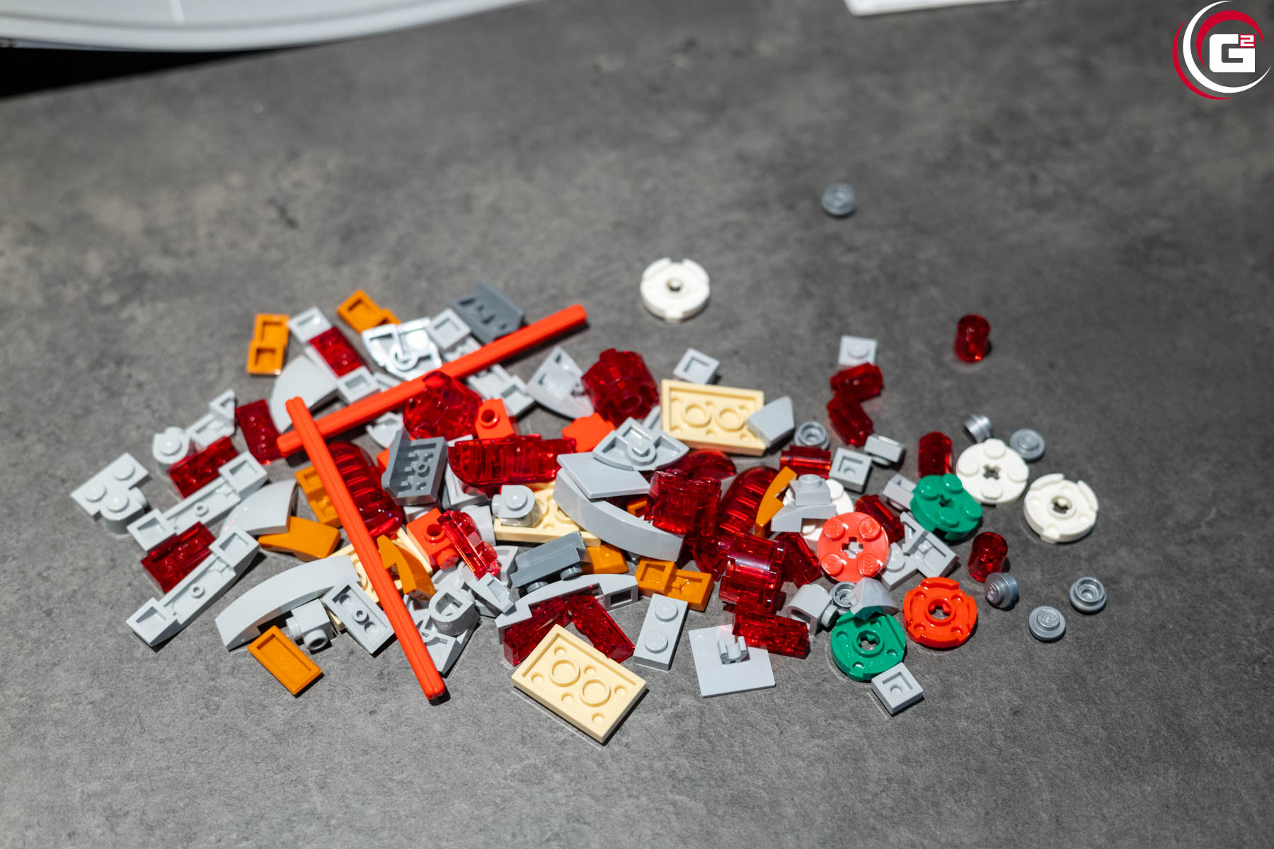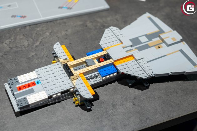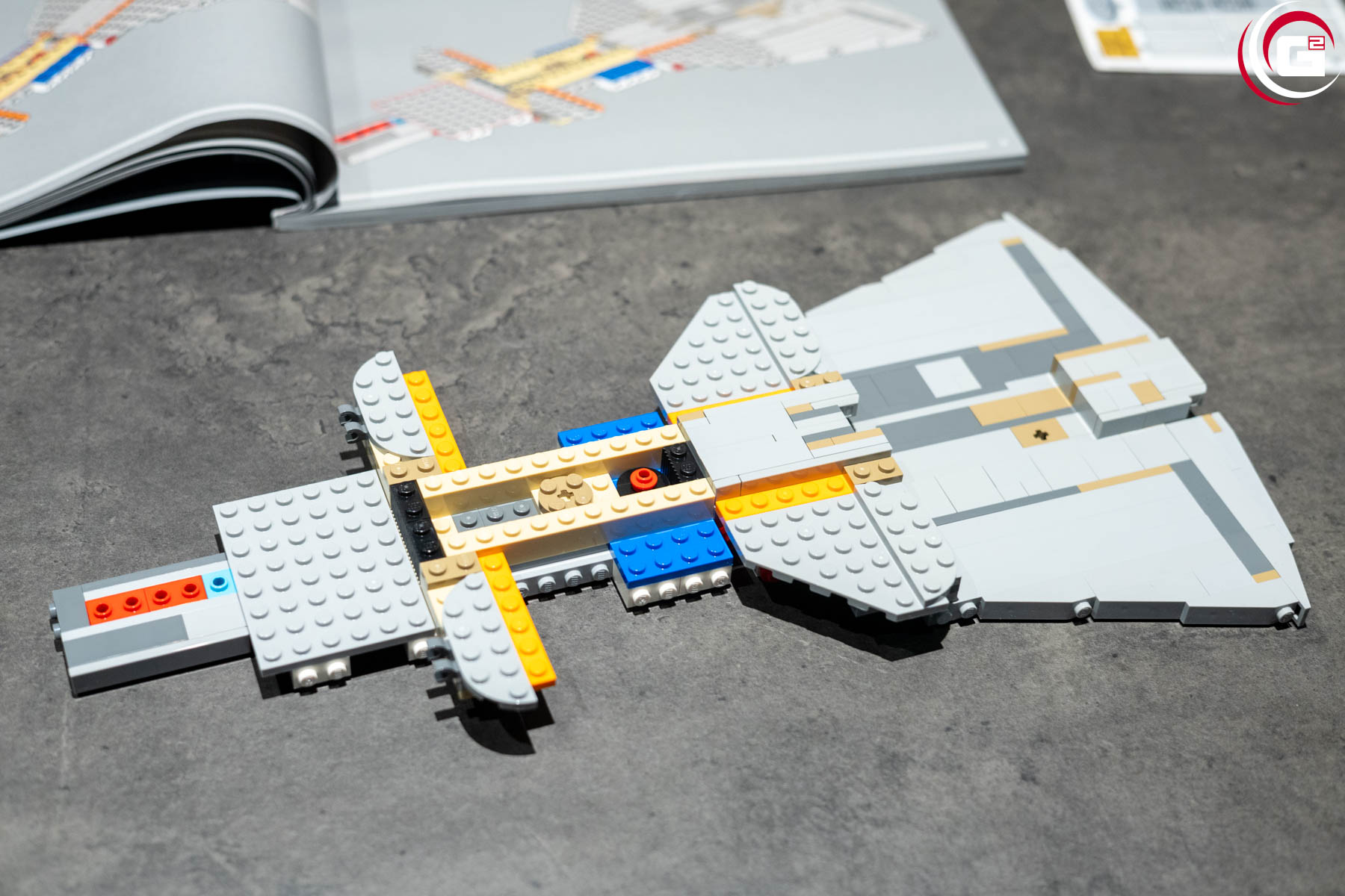 Wie man es von LEGO kennt, sind die Qualität der Bausteine und die Passgenauigkeit hervorragend, auch die Farbgebung ist homogen. Gestaltung und Detaillierung sind hier auf einem extrem hohen Niveau angesiedelt. Es kommen sehr viele bedruckte Teile zum Einsatz, insbesondere an den besonders markanten Stellen. Es gibt jedoch auch einige Sticker, die man ruhig durch weitere bedruckte Teile hätte ersetzen können. Durch seine Größe besitzt das Modell natürlich ein durchaus beeindruckendes Gewicht. Dank der extrem stabilen Konstruktion stellt dies kein Problem dar und auch der Modellständer ist so konzipiert, dass er das Modell stets stabil hält. Hierbei wurde auch berücksichtigt, dass das Modell nicht das Gleichgewicht verlieren darf, wenn man die Untertassensektion abnimmt. Zum Tragen wird in der Anleitung darauf hingewiesen, wie man das Modell am besten greifen kann, ohne etwas zu beschädigen.