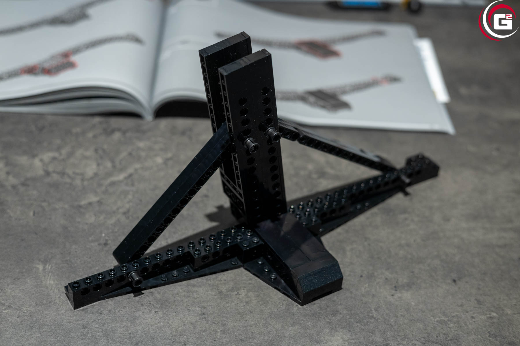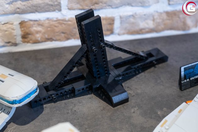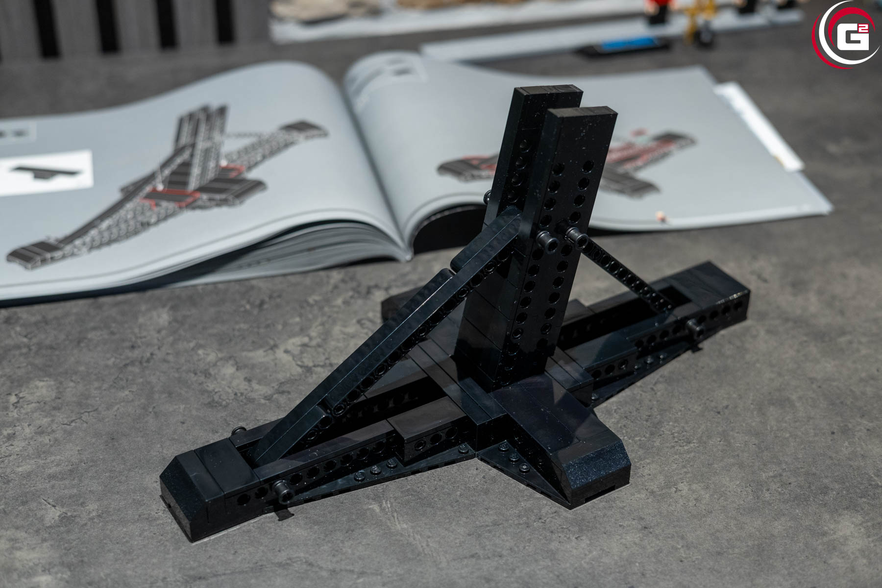 Da unsere Antriebssektion nun bis auf die Gondeln der Warp-Antriebe vollständig ist, widmen wir uns als Nächstes dem Modellständer. Denn für alle weiteren Bauschritte bedarf es eines festen Stands unseres Modells. Trotz der Modellgröße ist der Ständer überraschend kompakt und es bedarf so nur zwei Bauschritte, um ihn fertigzustellen. Das Modell wird hier einfach nur aufgesteckt. Passend dazu haben wir in den vorherigen Schritten Öffnungen im Modell aufgebaut.