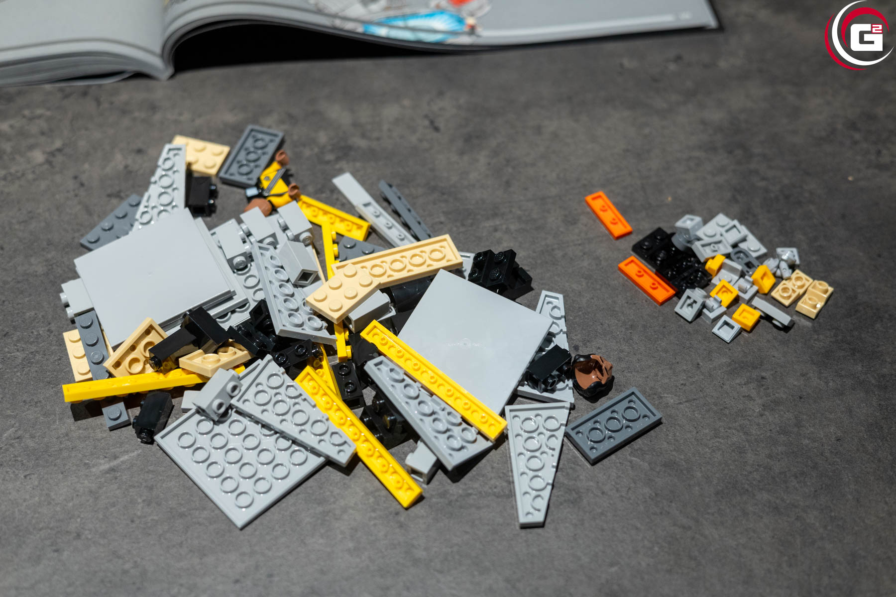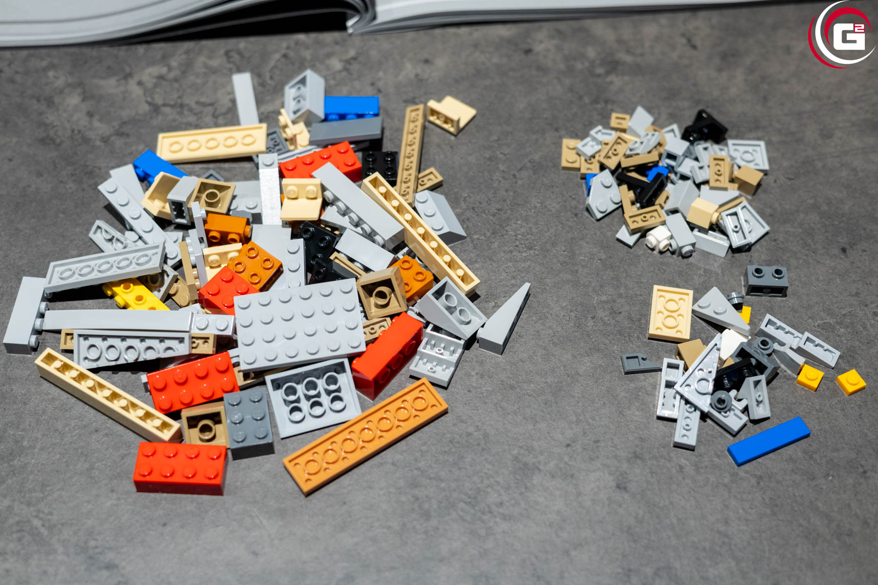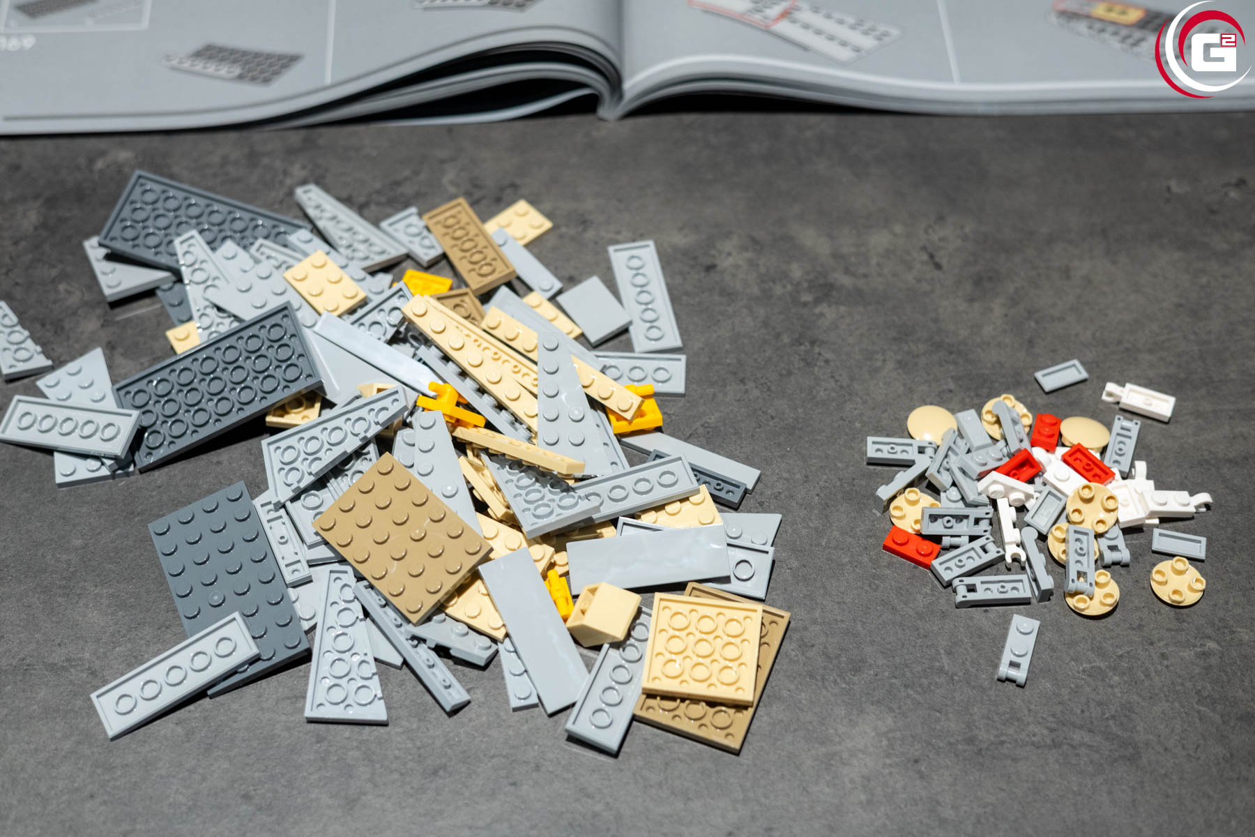 In der Verpackung finden sich neben der gedruckten, zweiteiligen Bauanleitung ganze 30 Papierbeutel und tatsächlich auch ein paar Aufkleber. Eine Hälfte der Tüten befindet sich in einem separaten Karton. Alle Baustufen befinden sich in Papiertüten, lediglich ein paar zusätzliche Bauelemente befinden sich in einer Plastiktüte. Zur Verbesserung der Nachhaltigkeit hat LEGO Ende letzten/Anfang dieses Jahres mit dem Wechsel von Plastik- zu Papiertüten begonnen, was sich allerdings noch nicht bei allen Sets zeigt.
