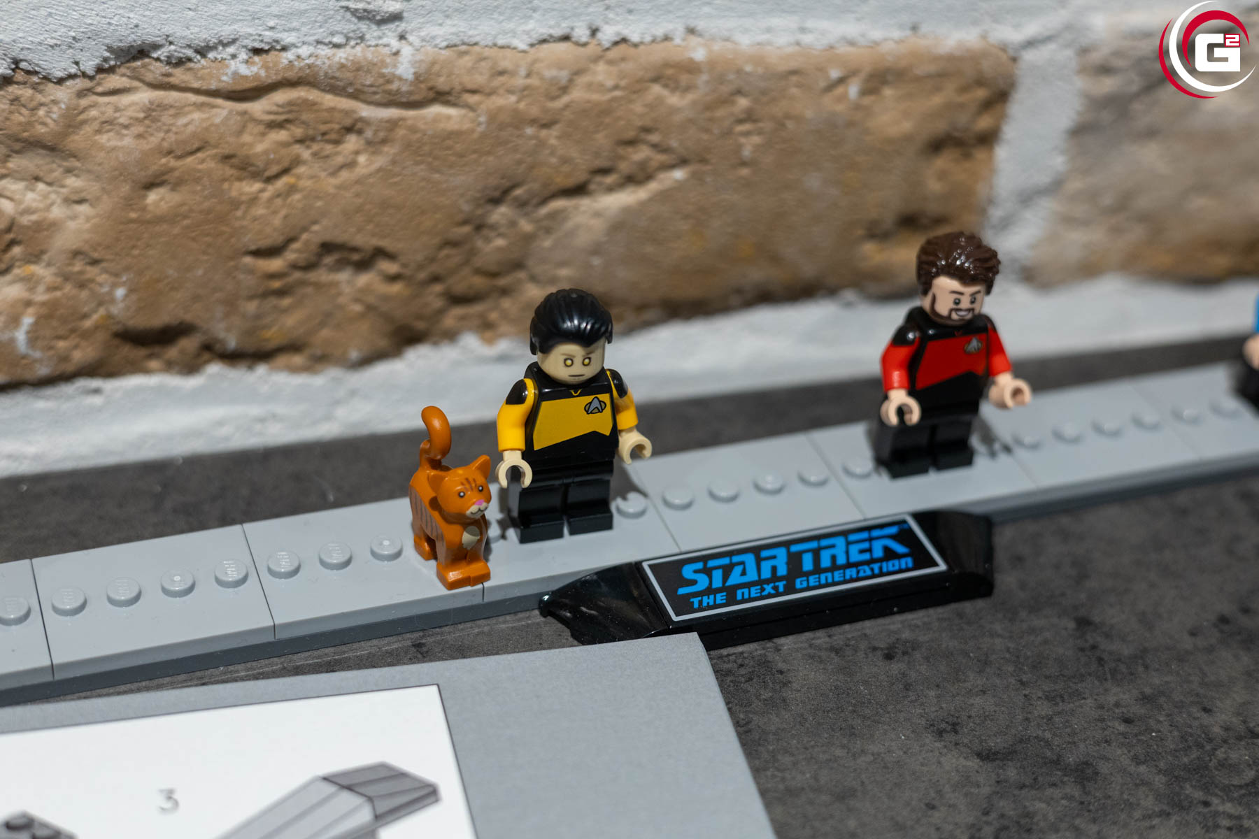 Die Bauschritte 20 und 21 fallen in der Bauanleitung zusammen. Denn hier muss man alle Teile immer zweimal anfertigen, dass sie an Steuer- und Backbordseite spiegelverkehrt montiert werden. Doch eine Sache ist hier nicht doppelt, Commander Data schließt sich der Crew an und wird von seiner Katze Spot begleitet.