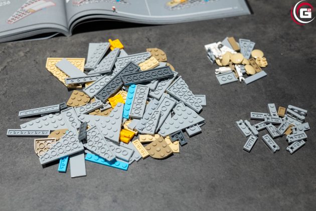 Interessanterweise beginnt beim Set LEGO Icons 10356 – Star Trek USS Enterprise NCC-1701-D der Bau nicht mit dem Modellständer. Stattdessen starten wir mit der Antriebssektion. Mit den ersten zwei Baustufen beginnen wir mit der Montage der Backbord-Hälfte (links) und bekommen die Minifigur von Wesley Crusher. Damit wir unsere Figuren auch stilecht präsentieren können