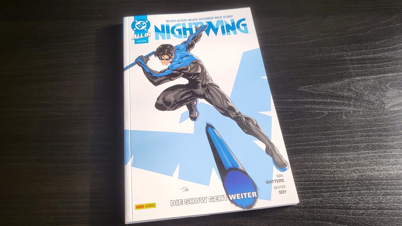 Nightwing Band 5 – Die Show geht weiter ist der Anfang der Dan Watters Saga. Das Band kommt im Format 17X26 daher und das Cover ist schlicht gehalten, mit einer kleinen Widmung des Zeichners. Mit seinem Übergang der Blautöne zwischen weiß und schwarz ist es doch schön anzusehen. Dexter Soy, der Zeichner, wird von Veronica Gandini mit der Farbe unterstützt. Es ist erstaunlich, was Farbe bewirken kann, wenn sie der Umgebung und dem Protagonisten angepasst ist. In den Nightwing Abschnitten ist alles sehr viel dunkler und blau, während am Morgen der Tag in kräftigen gelb und orange erstrahlt und Dick Grayson oberkörperfrei telefoniert. Das neue Team arbeitet mit vielen großen Panels. Meistens, um einen Eindruck von der gesamten Umgebung des Geheimquartiers zu bekommen oder ein schön in Szene gesetzter Fußtritt von Nightwing.
