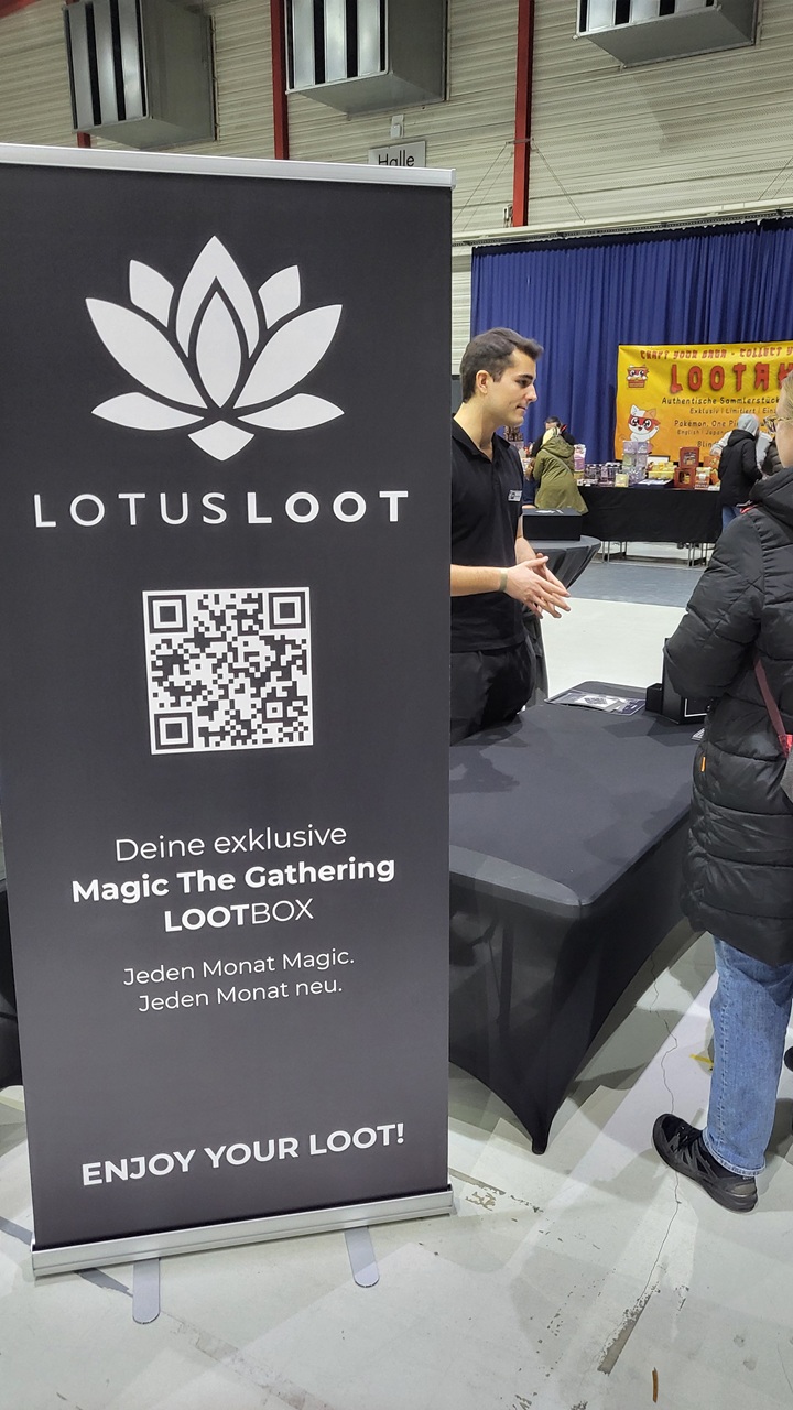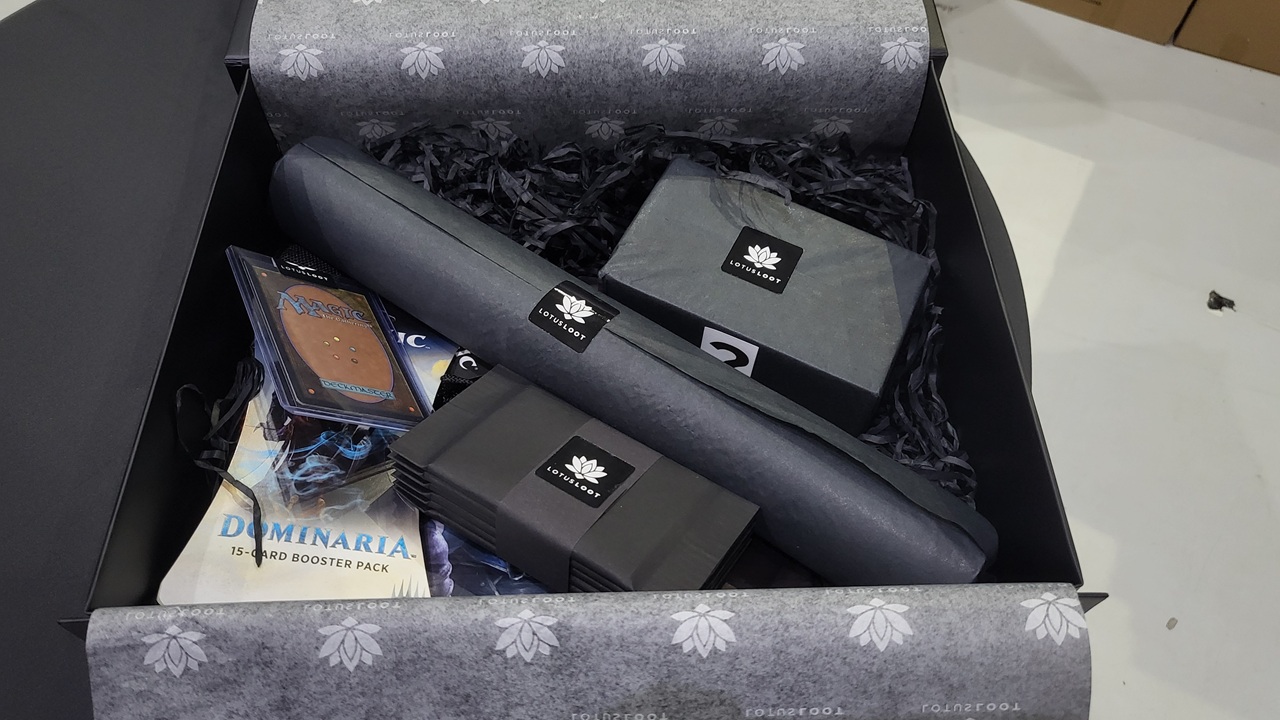 Kennt ihr noch die Zeit, als Lootchest Mystery Boxen voll im Trend waren? Das gibt es wieder für Magic: The Gathering. Lotusloot bietet Mystery Boxen extra für dieses Franchise an! Jede Box enthält verschiedene Überraschungs-Booster, Zubehör und eine exklusive Sammelkarte im Toploader. Die Pakete gehen monatlich an die Abonnenten. Es gibt die Box für einen einmaligen Monat für 49,99 Euro oder drei, sechs und zwölf + eins gratis – Monate. Der Preis sinkt natürlich mit der ausgewählten Laufzeit. Im Beispielbild sind die geheimen Booster zu sehen mit Spielmatte und vieles mehr. Das ganze schön verpackt im Lotusloot Geschenkpapier.