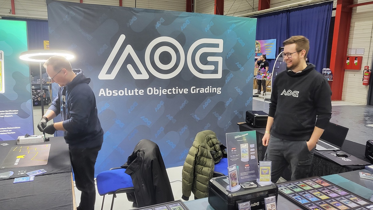 Wo wir schon bei dem Thema Grading sind. Ein Grading Service aus Deutschland war ebenfalls auf der Messe vertreten. AOG Absolute Objective Grading. Die zwei sympathischen Herren vom Stand haben mir direkt etwas zu deren Leistung und Preise erzählt. Gezeigt wurde das Material, welches sie zum Einschweißen und die Verarbeitung der Karte verwenden und dass sie verschiedene Halterungen im Inneren haben, um ein Verrutschen oder Beschädigung zu verhindern. Dies liegt an den verschiedenen Maßeinheiten der Karten, wie zum Beispiel Pokémon und Yu-Gi-Oh!