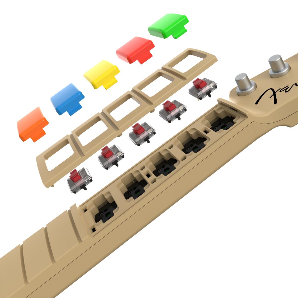 Austauschbare Komponenten wie Korpus, Fret-Buttons, Kopfplatte, Whammy-Bar und Strum-Bar. 3D-Druckdateien werden zum Launch öffentlich verfügbar gemacht. - Accessibility-First-Ansatz