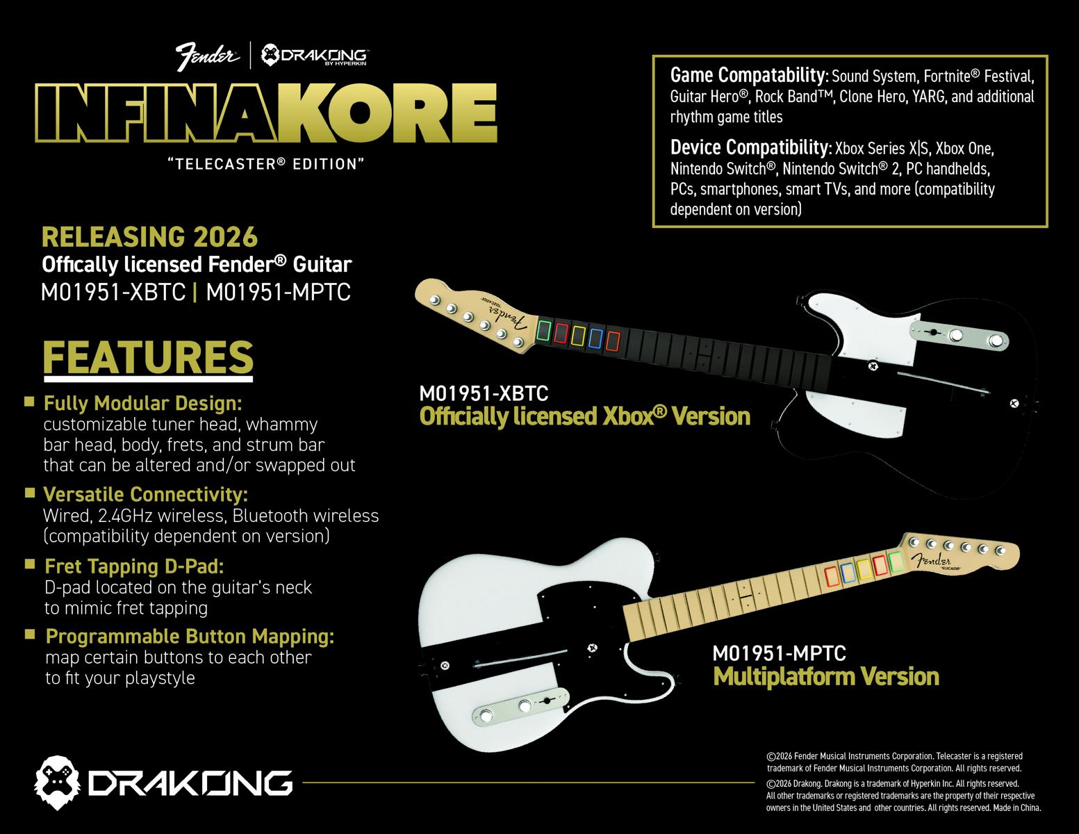 Drakong™, ein führendes Gaming-Hardware-Unternehmen mit Sitz in Los Angeles, das sich auf Next-Generation-Peripherie für ein besonders intensives Spielerlebnis spezialisiert hat, hat kürzlich die Bühne für sein bislang ambitioniertestes Produkt bereitet: den heiß erwarteten InfinaKore „Telecaster® Edition“ Guitar Controller, der vom 6. bis 9. Januar 2026 erstmals der Öffentlichkeit in Las Vegas präsentiert wurde.
