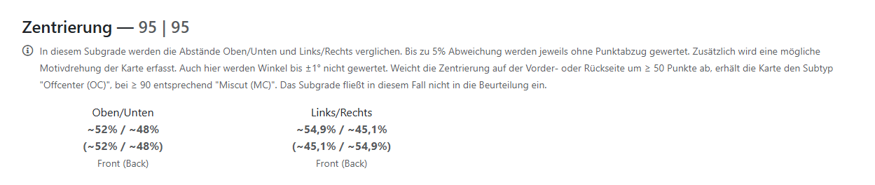 Wie ihr sehen könnt, sind die Zahlen eingestuft in frisch aus dem Booster bis hin zu gut, bespielt und schlecht. Bei der Zentrierung ist darauf zu achten, dass das Motiv von Vorder- und Rückseite mittig platziert ist. Der Abgleich erfolgt über Prozente. Bei dieser Karte waren es nun 52% zu 48%. Am schwarzen Rand der Magic Karte könnt ihr eine leichte Abweichung nach links sehen.