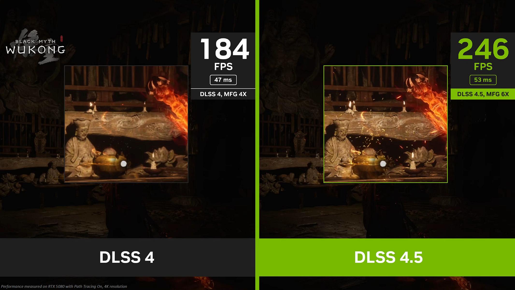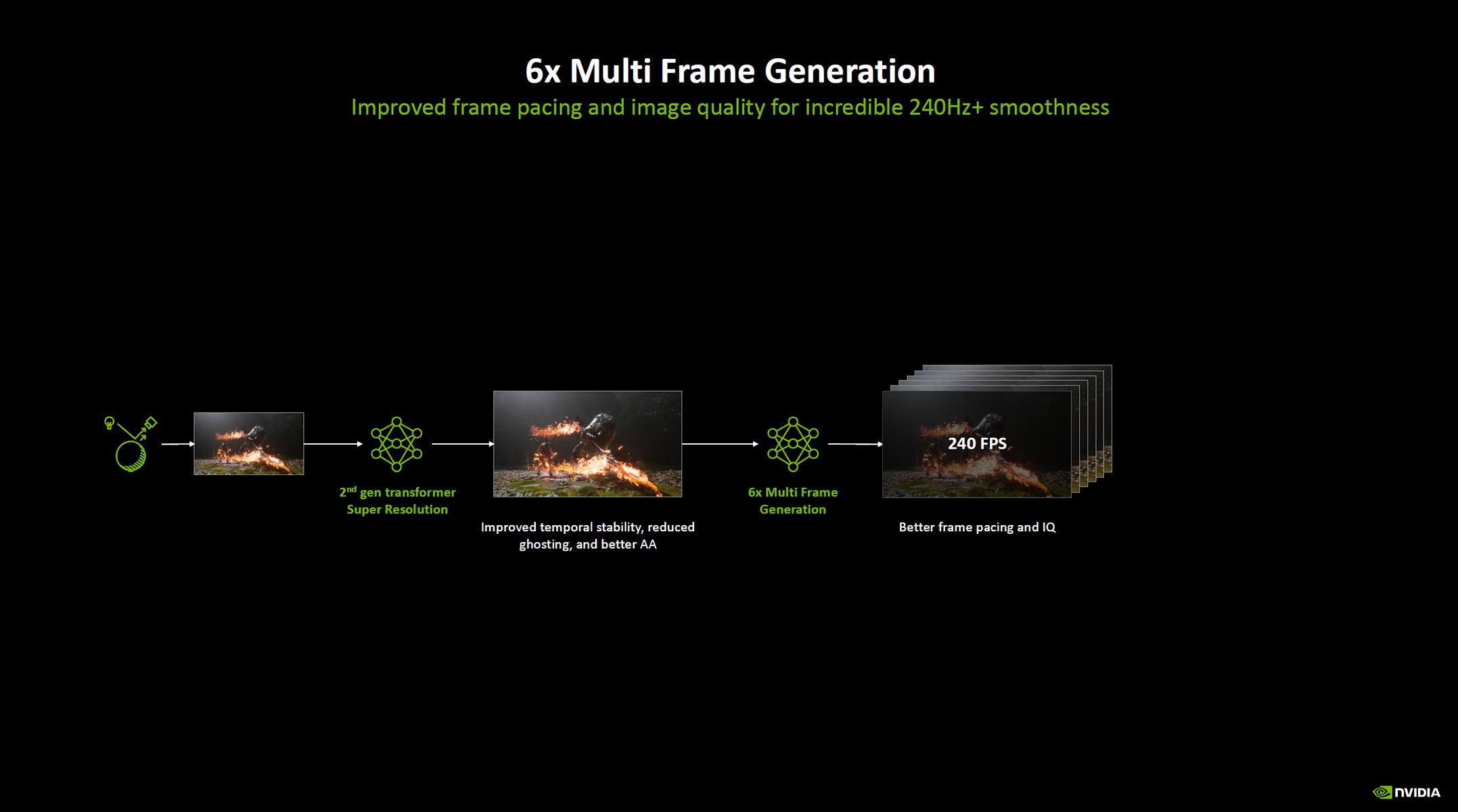 Mit DLSS 4.5 kommt auch ein Upgrade der Multi Frame Generation. Während DLSS 4 bereits vier zusätzliche KI-generierte Frames pro nativ gerendertem Frame lieferte, geht DLSS 4.5 nun einen Schritt weiter: Mit dem neuen 6X-Modus kann die KI bis zu fünf zusätzliche Frames erzeugen. Das sorgt für bisher unerreichte Flüssigkeit in der Darstellung, insbesondere auf Monitoren mit hohen Bildwiederholraten wie 240 Hz oder sogar 360 Hz.