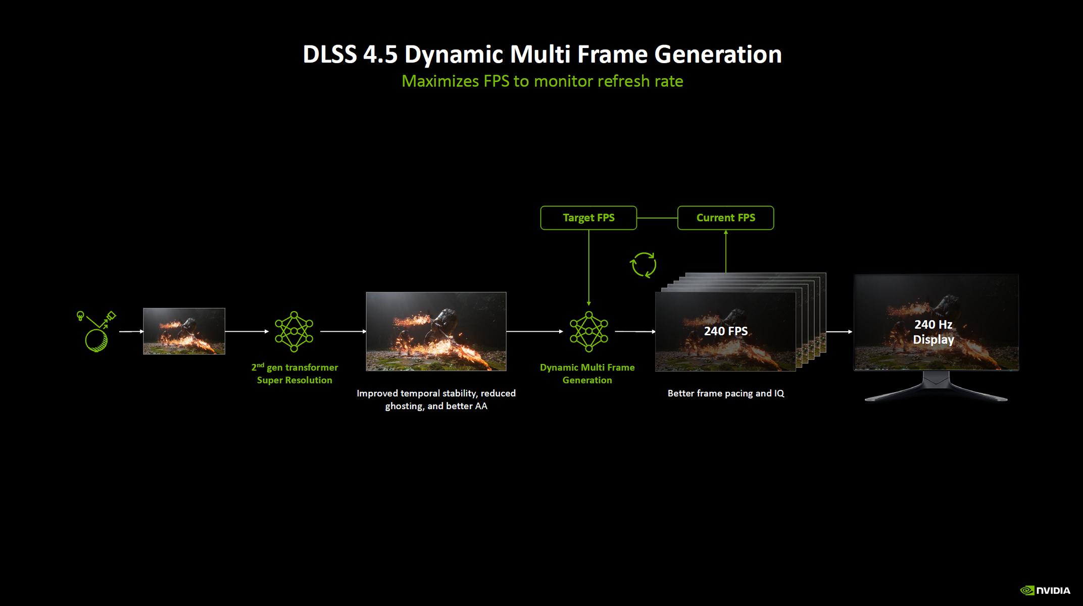 Eine der spannendsten Neuerungen von DLSS 4.5 ist die Dynamic Multi Frame Generation. Sie funktioniert wie ein intelligentes Getriebe für die GPU: Anstatt starr auf einen festen Multiplikator wie 4X oder 6X zu setzen, passt das System die Anzahl der KI-generierten Frames in Echtzeit an die Leistung der GPU und die Bildwiederholrate des Monitors an. Somit wird sichergestellt, dass nicht mehr Frames erzeugt werden, als vom Monitor angezeigt werden können.