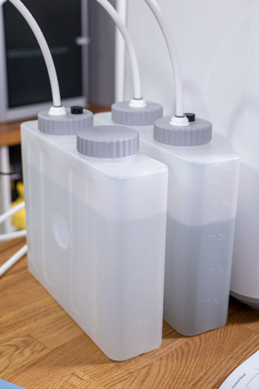 Vor dem ersten Reinigungsdurchgang müssen wir zunächst die Tanks füllen. Diese haben jeweils ein maximales Füllvolumen von 5 Litern. Da in der Beschreibung auf der Webseite von Anycubic die Rede von einem Alkoholbedarf von 4 Litern war, haben wir diese Menge auch zuerst eingefüllt. Beim ersten Reinigungsvorgang haben wir dann allerdings festgestellt, dass diese Menge nicht reicht, denn die Station flutet zum Ende des Reinigens mit Alkohol den unteren Teil des Waschraums mit dem Alkohol. Mit einem Füllstand von 4 Litern zog sie dabei Luft, daher beide Tanks immer bis zur 5-Liter-Marke füllen. Der Reingungsvorgang kann dann dennoch erfolgreich abgeschlossen werden, allerdings kann durch den geringeren Pegel beim Fluten des Innenraums möglicherweise in Resinrest verbleiben.