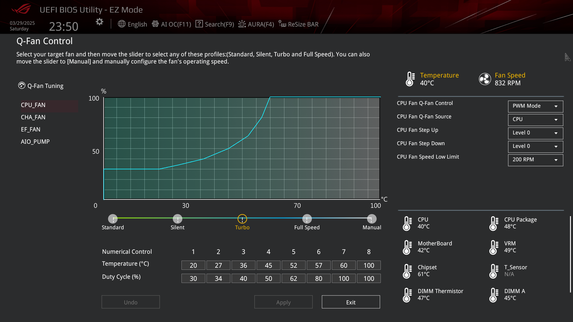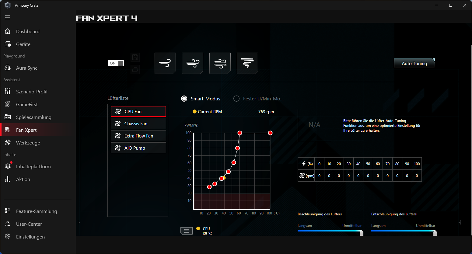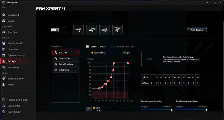 Mit Fan Expert 4 lassen sich individuelle Lüfterprofile manuell erstellen oder automatisch durch AI Cooling II optimieren. Dazu wird der gesamte PWM-Bereich des Lüfters durchlaufen, um die Drehzahl zu messen und den steuerbaren Bereich zu ermitteln. Bei aktivierter automatischer Lüfterregelung kann man zwischen den Modi Leise, Standard, Turbo und Volle Geschwindigkeit wechseln. Alternativ können eigene Lüfterkurven oder feste Drehzahlen für einzelne Kanäle definiert werden.