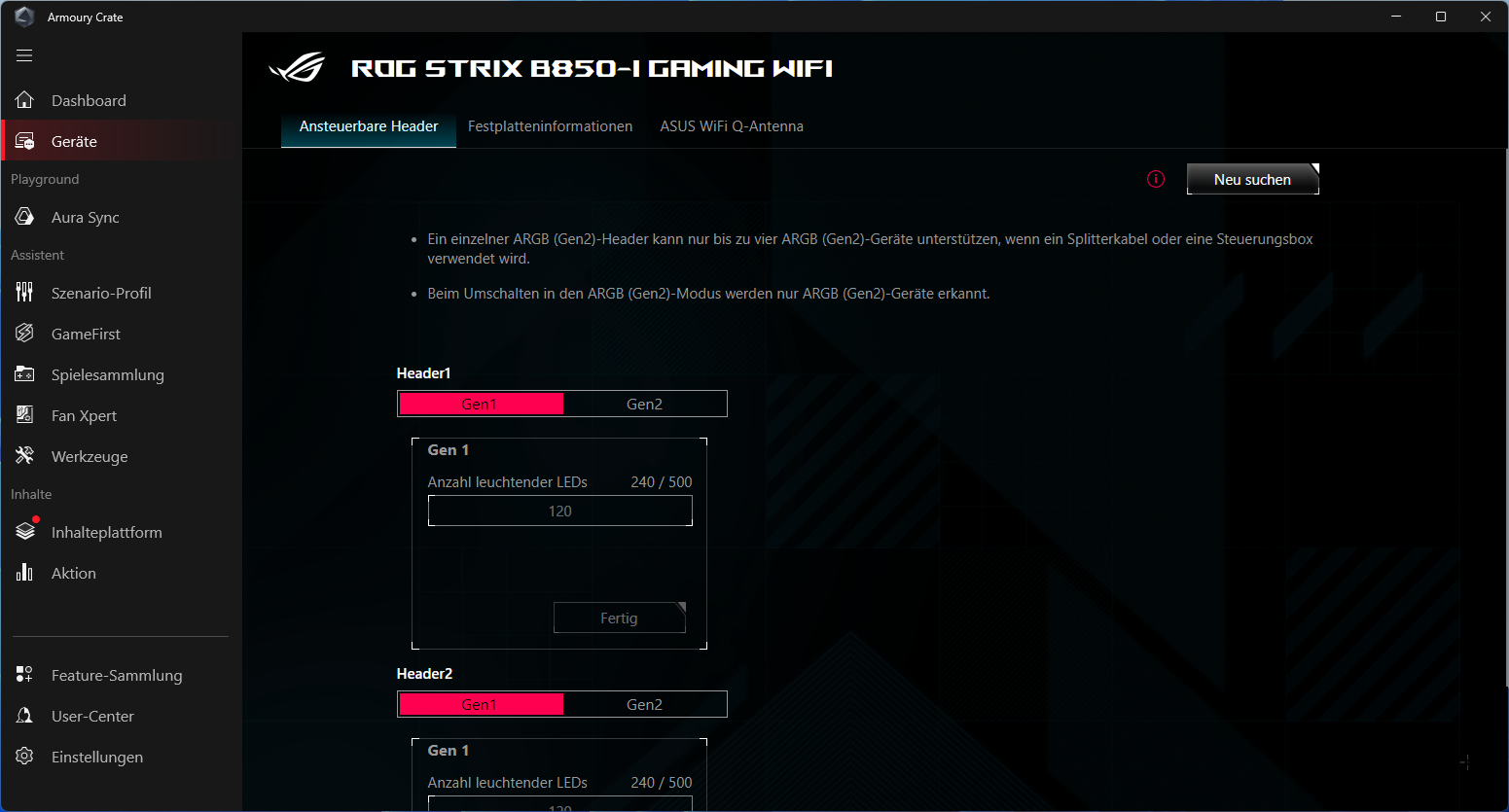 Armoury Crate ist die zentrale Verwaltungssoftware von ASUS, mit der sich nicht nur Mainboards, sondern auch komplette Notebooks anpassen lassen. Besonders in Kombination mit Mainboards entfaltet das Tool sein volles Potenzial – von der Lüftersteuerung mit Fan Expert 4 bis zur ARGB-Beleuchtungskonfiguration über Aura Sync. Zudem können Treiber und weitere Management-Tools direkt aktualisiert werden.