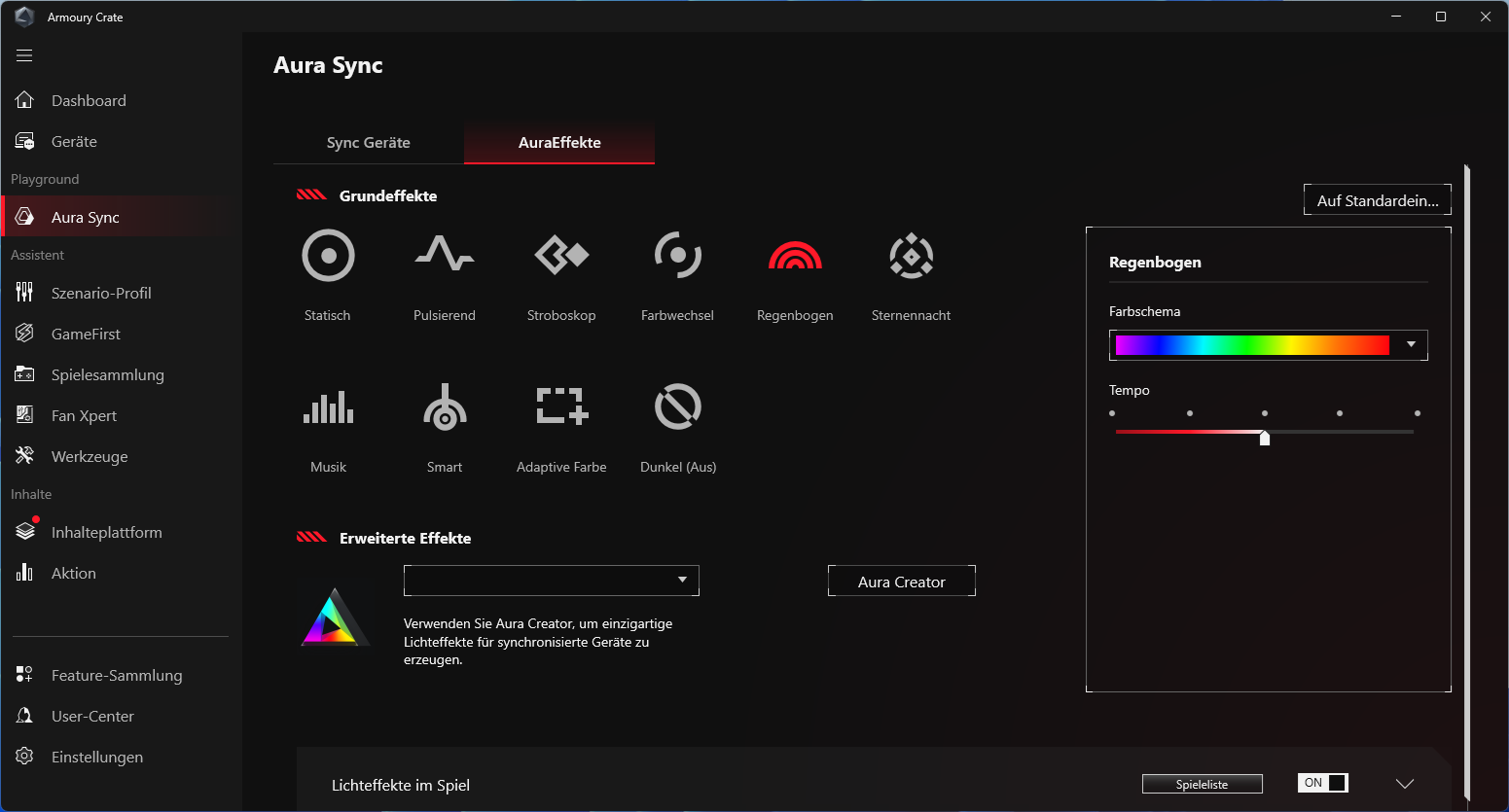 Über Aura Sync können sämtliche Aura-kompatible Geräte synchronisiert und einheitliche Beleuchtungseffekte konfiguriert werden. Neben klassischen Effekten wie pulsierendem Licht oder Regenbogen lassen sich Farbgebung und Geschwindigkeit individuell anpassen. Wer mehr Gestaltungsfreiheit möchte, kann im Aura Creator eigene Effekte für jedes Gerät separat entwerfen.