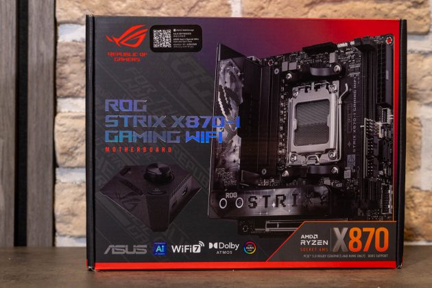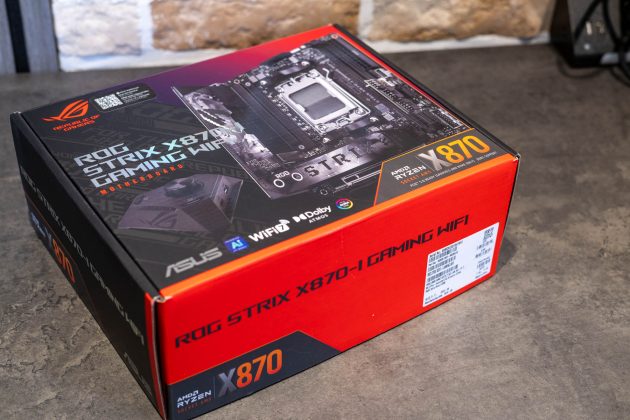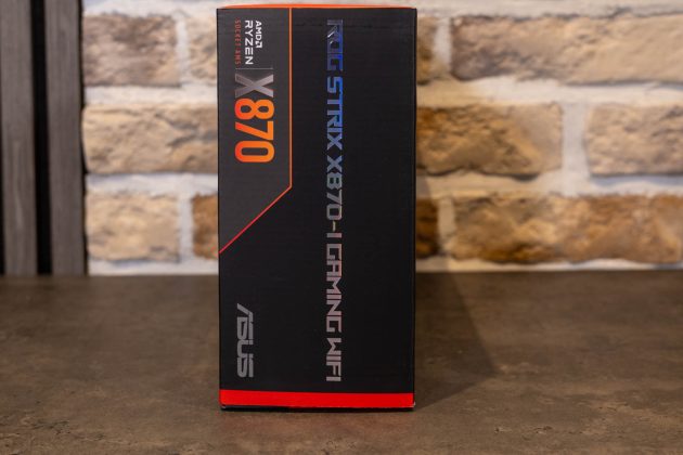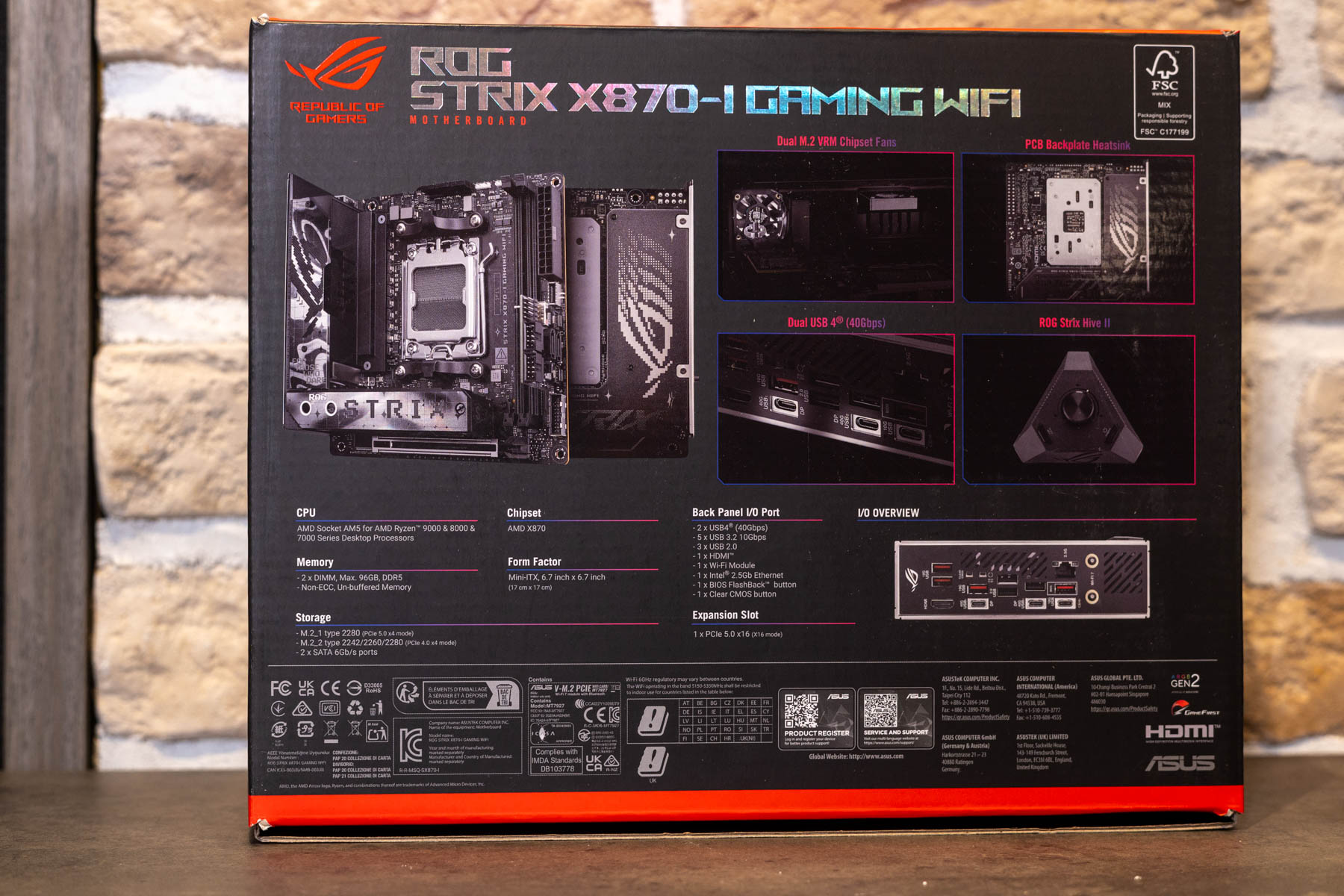Die Verpackung des ASUS ROG STRIX X870-I Gaming WiFi ist im charakteristischen ROG-Design mit roten Seiten und einer sonst eher an der Farbe Schwarz orientierten Optik gestaltet. Auf der Vorderseite findet sich eine Produktabbildung und auf der Rückseite finden sich technische Daten, eine Abbildung des I/O-Shields und weitere Abbildungen.