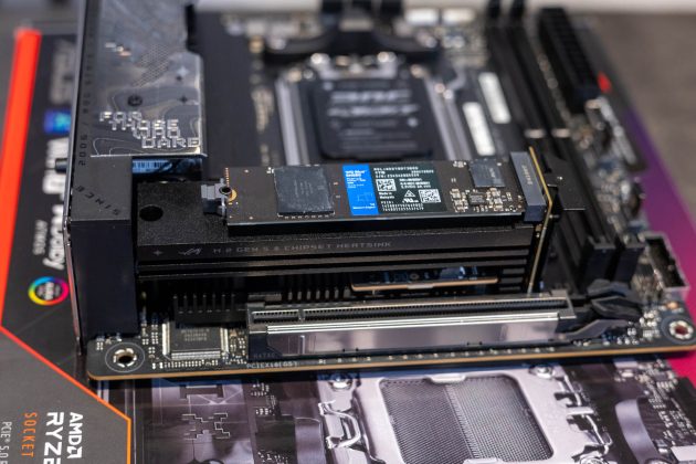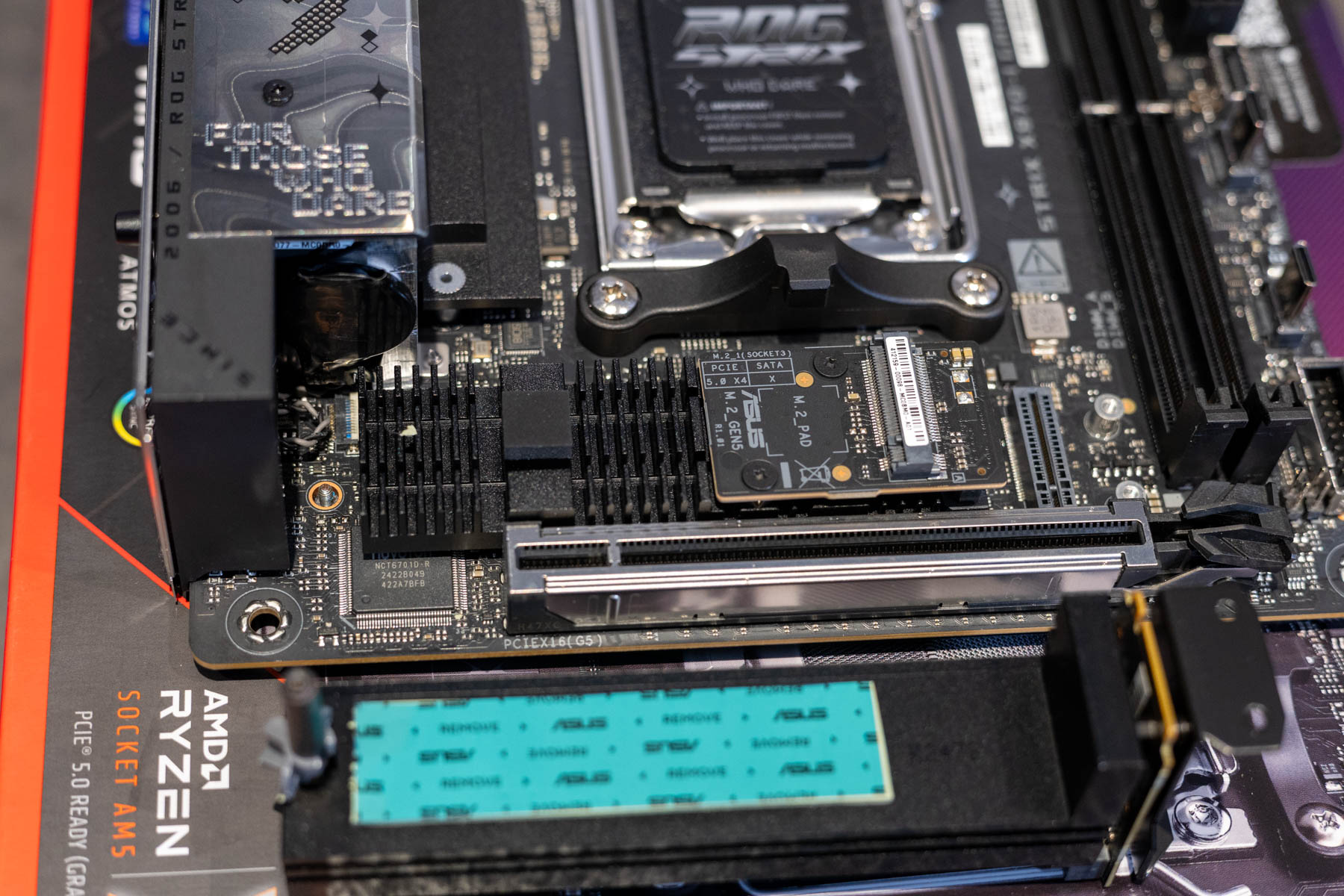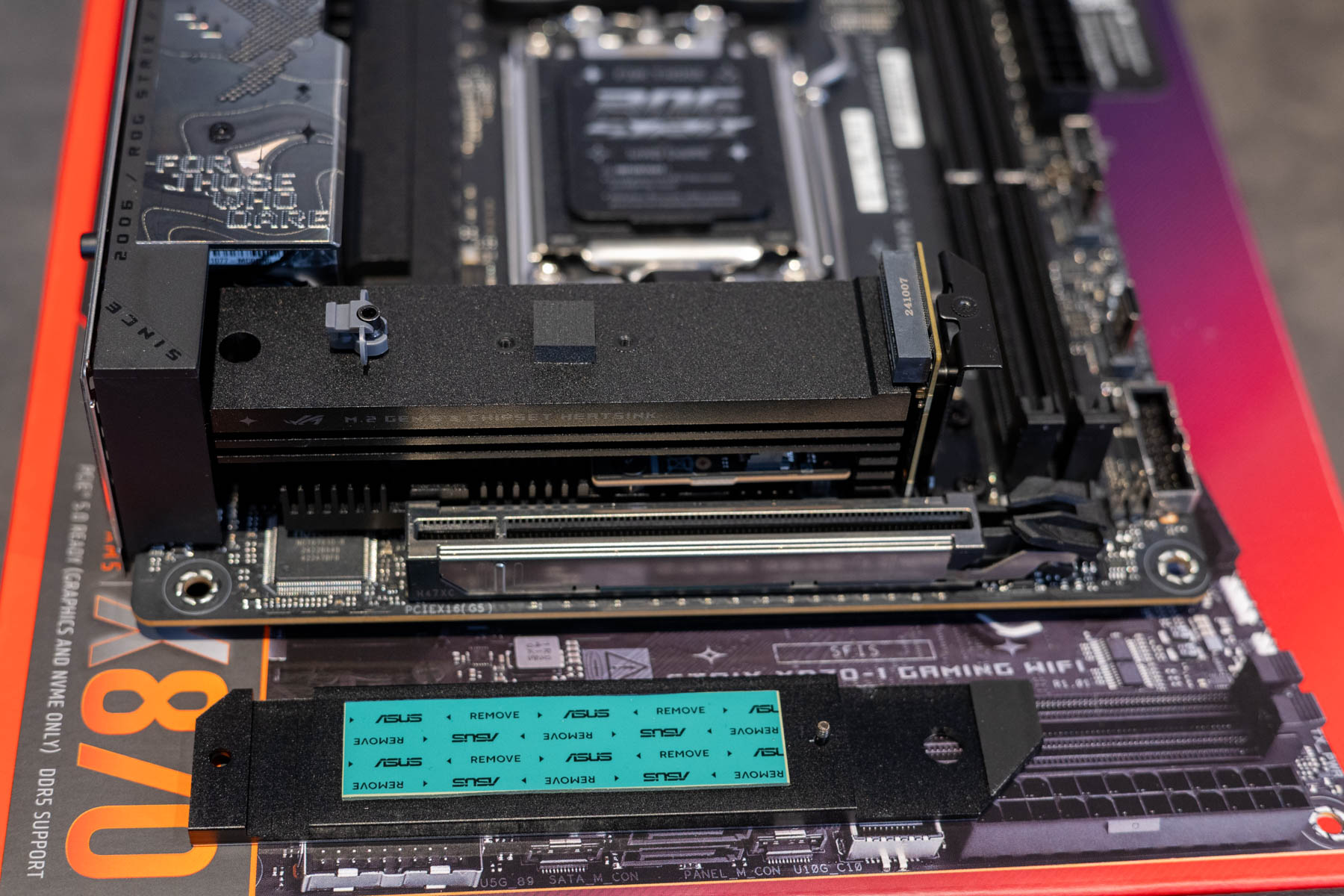 Das ASUS ROG STRIX X870-I Gaming WiFi sollte man im Gehäuse definitiv verschrauben, bevor etwas aufgesteckt oder angeschlossen wird. Ansonsten ist der Zugang etwas schwieriger. Um die obere SSD zu montieren, hier befindet sich der PCIe-4.0-Anschluss, der vom Chipsatz bereitgestellt wird, muss man nur die obere Abdeckung abnehmen. Für den unteren Slot, der via PCIe-5.0 an die CPU angebunden ist, nimmt man den mittleren Teil (mit montierter SSD) ab. Je nachdem, ob einseitig oder beidseitig bestückte SSDs zum Einsatz kommen, muss man gucken, auf welche Gummipuffer man zurückgreifen muss, damit ein optimaler Kontakt sichergestellt ist. Fixiert werden die NMVe-SSDs mittels ASUS Q-Latch über drehbare Elemente.