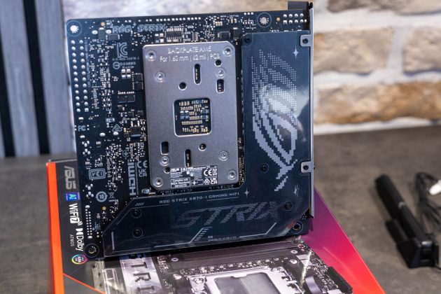 Besonders auffällig beim ASUS ROG STRIX X870-I Gaming WiFi sind die effektvoll spiegelnden Oberseiten des VRM- und SSD-Kühlers mit dem eingearbeiteten ROG- und STRIX-Logo. Diese finden sich auch auf der Rückseite auf der L-förmigen Backplate wieder. Passend dazu ist das PCB in Schwarz gehalten. Die beiden Kühlkörper fallen sehr voluminös aus und sind abgesehen von der Oberseite mattschwarz. Durch den sehr kompakten Aufbau des Boards gibt es ansonsten keine weiteren besonderen Designelemente.