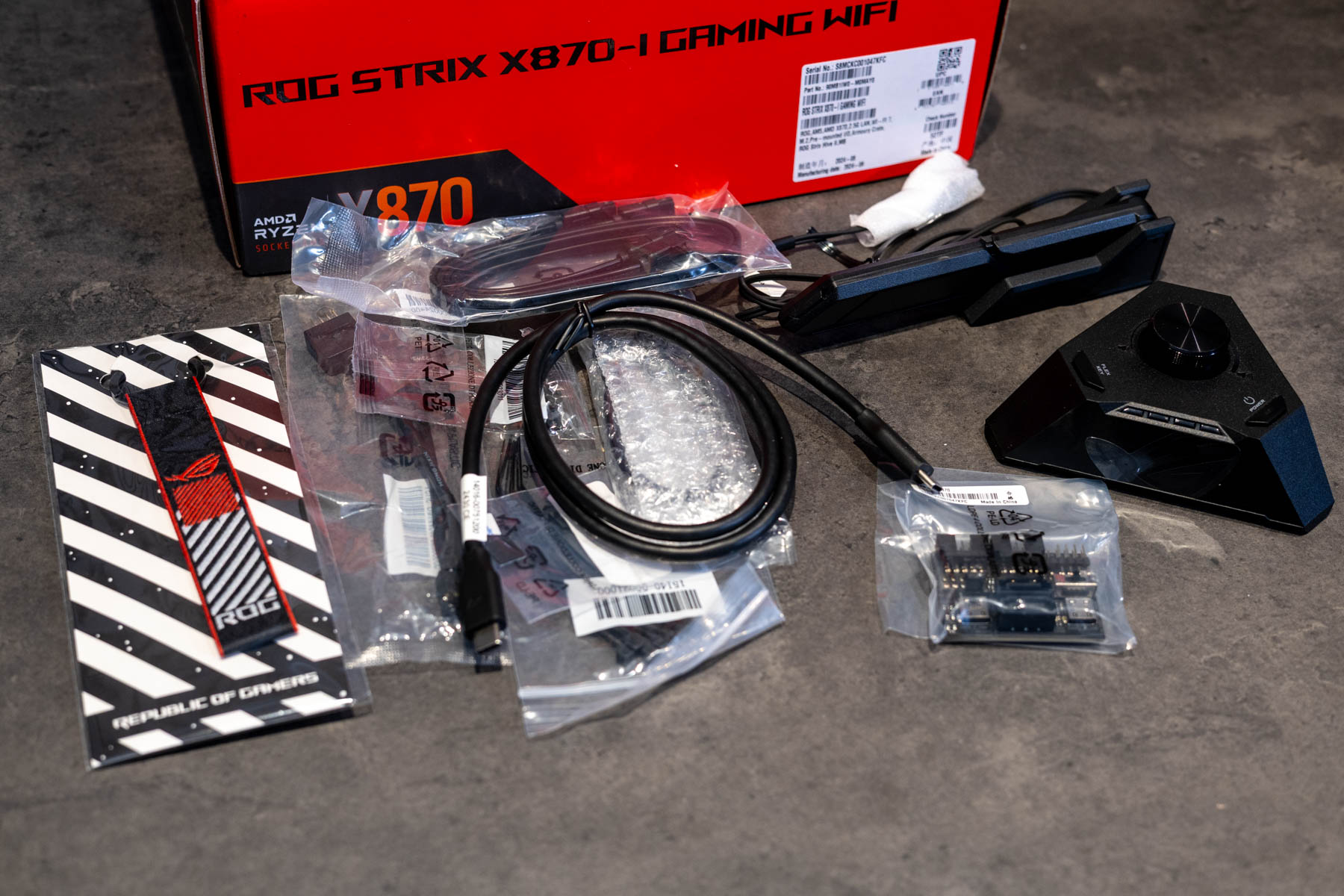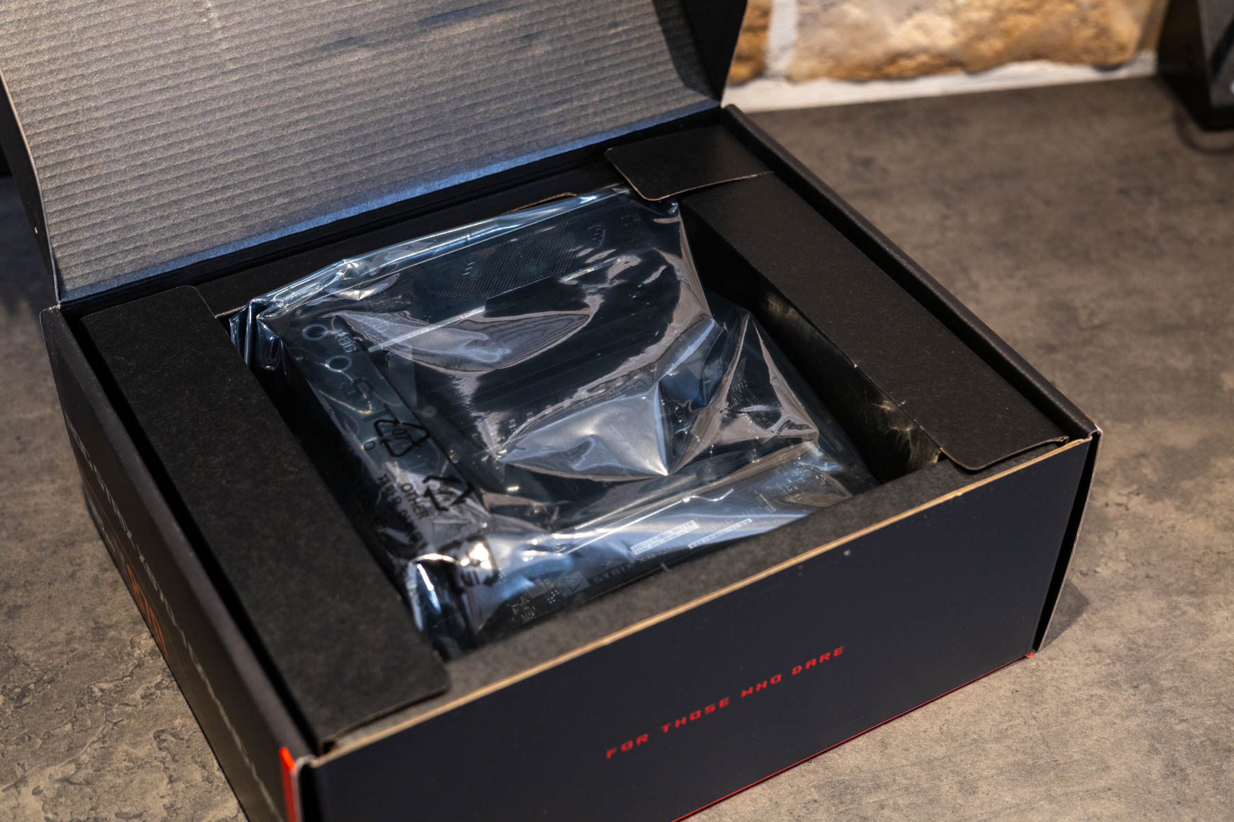 Der Lieferumfang besteht neben dem Mainboard aus dem ROT STRIX HIVE II inklusive Anschlusskabel, der ROG FPS Card, der ASUS WiFi Q-Antenne, einem USB-2.0-Splitterkabel, zwei SATA-Kabeln, Kabelbindern, dem M.2 Q-Latch-Zubehör, einen ROG Schlüsselanhänger, einem ROG STRIX Aufkleber und Gummiunterlegklötze für die NVMe-SSDs.