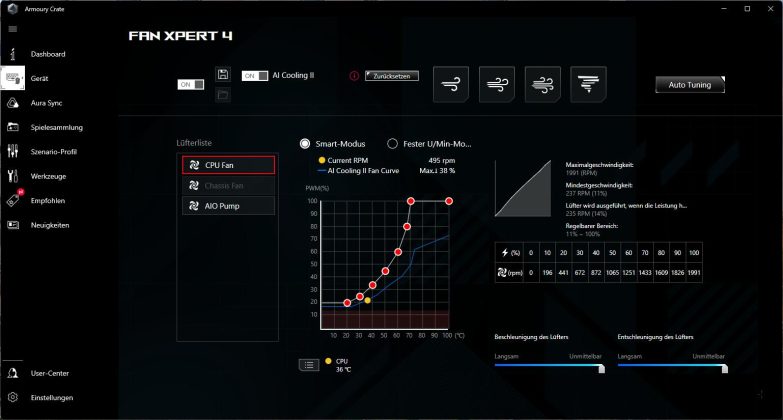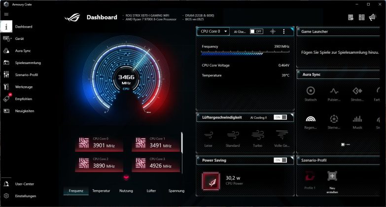 Das Dashboard bringt zunächst einen Überblick über das gesamte System. Hier kann man auch die ein oder andere Automatik, wie AI Cooling II oder automatisches Energiesparen, Ein-/Ausschalten. Auch verschiedene Aura-Sync-Presets lassen sich hier aufrufen.