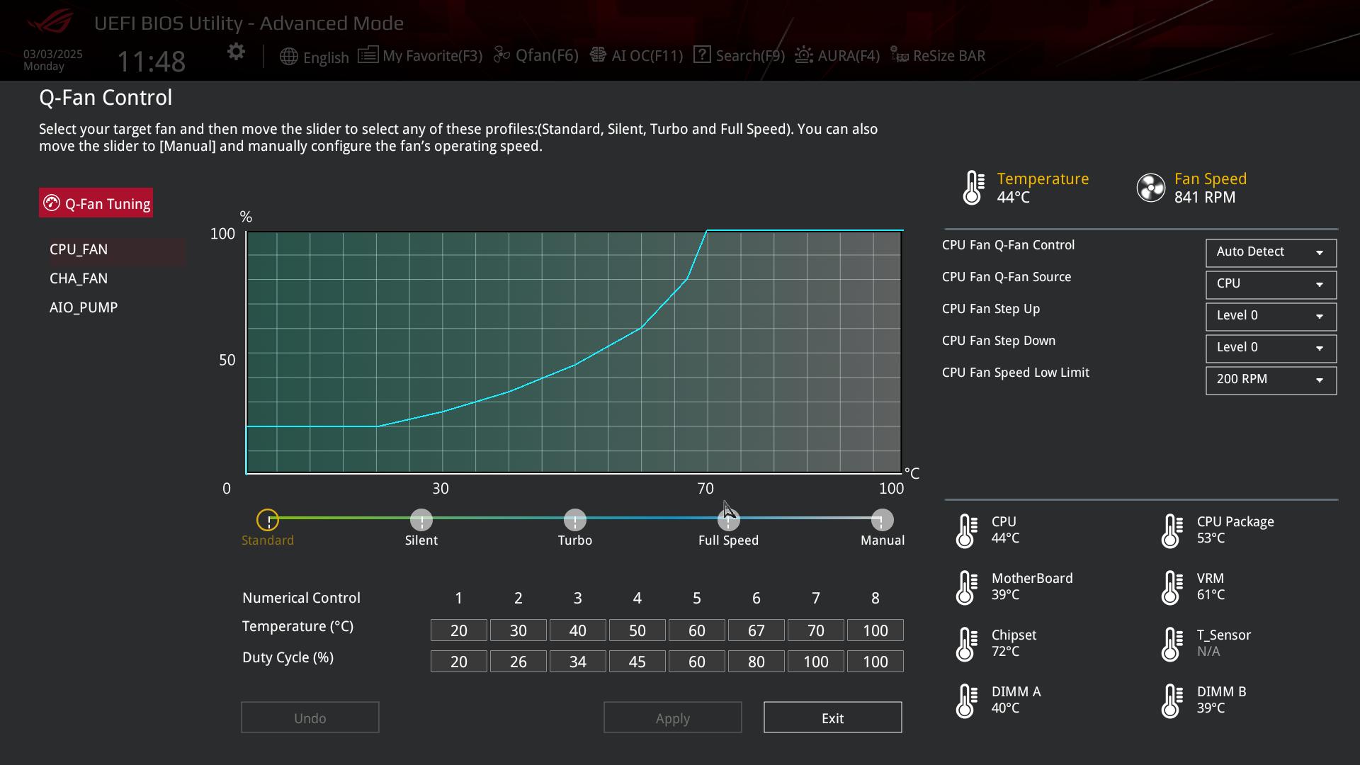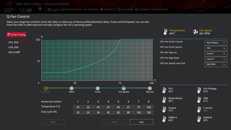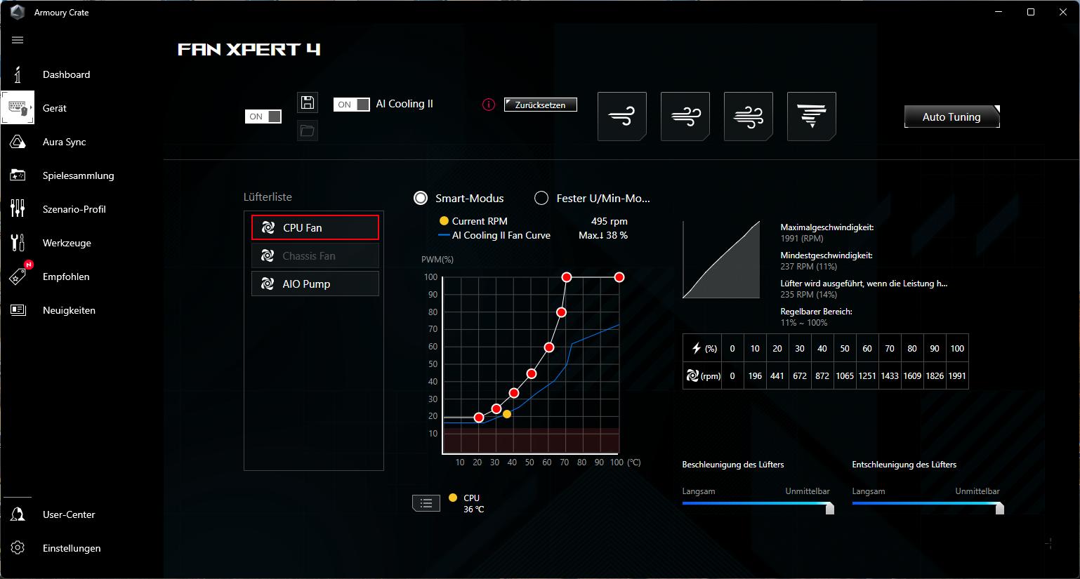 Fan Expert 4 ermöglicht es, Lüfterprofile manuell zu erstellen oder automatisch für AI Cooling II ermitteln zu lassen. Hierzu wird der Lüfter über den gesamten PWM-Bereich geregelt und dabei die Drehzahl gemessen. So wird der regelbare Bereich zum einen bezogen auf die Drehzahl und zum anderen bezogen auf das PWM-Signal festgestellt. Ist die automatische Lüfterregelung aktiv, kann man manuell auch zwischen den Presets Leise, Standard, Turbo und Volle Geschwindigkeit wählen. Manuelle Profile kann man für jeden Kanal separat erstellen und hat hier die Wahl zwischen einer temperaturabhängigen Kurve und einer festen Drehzahlvorgabe.
