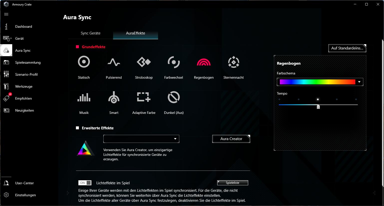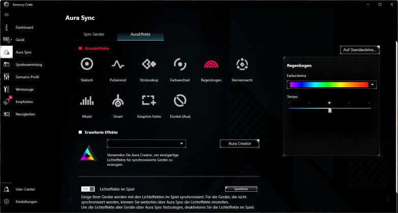 Aura Sync ermöglicht es, die Beleuchtungseffekte für Aura-kompatible Geräte gemeinsam zu konfigurieren, um einen einheitlichen Beleuchtungseffekt zu erzielen. Hier hat man die Wahl zwischen den klassischen Effekten, wie pulsierendem Licht, dem Regenbogen und vielen mehr. Die Presets lassen sich mit Blick auf Farbe und Effektgeschwindigkeit anpassen. Allerdings kann man auch eigene Effekte über den Aura Creator erstellen. Hier kann der Effekt für jedes Gerät einzeln angepasst werden.