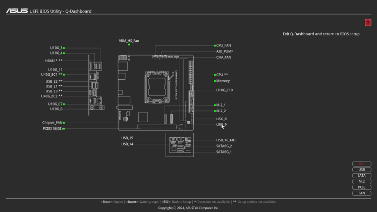 Im fortgeschrittenen Modus hat man alle Freiheiten für manuelles OC. Hier kann man sowohl für den RAM als auch für die CPU Spannungen, Taktraten usw. manuell einstellen und so Detailoptimierungen vornehmen. Kleine Tooltips geben zu allen Einstellungen eine kurze Erläuterung. Über eine Suchfunktion kann man einzelne Einstellungen bequem suchen, ohne sich durch lange Menüs quälen zu müssen. Verschiedene Tools, wie ein BIOS-Update-Tool runden die Ausstattung ab. Ein schönes neues Detail ist auch eine Übersichtsseite auf der anschaulich alle Anschlüsse und deren Status visualisiert werden.