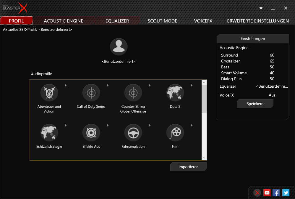 Ist die Software heruntergeladen und installiert können verschiedene Soundprofile ausgewählt werden, die für bestimmte Spieletitel, wie beispielsweise Counter-Strike: Global Offensive, optimiert sind. Mit der Software können auch individuelle Profile sowie Einstellungen erstellt, bzw. vorgenommen werden. So können unterschiedliche Features aktiviert, bzw. deaktiviert werden, die ein besseres Klangerlebnis ermöglichen. So kann der Surround-Sound sowie weitere Einstellungen konfiguriert werden.