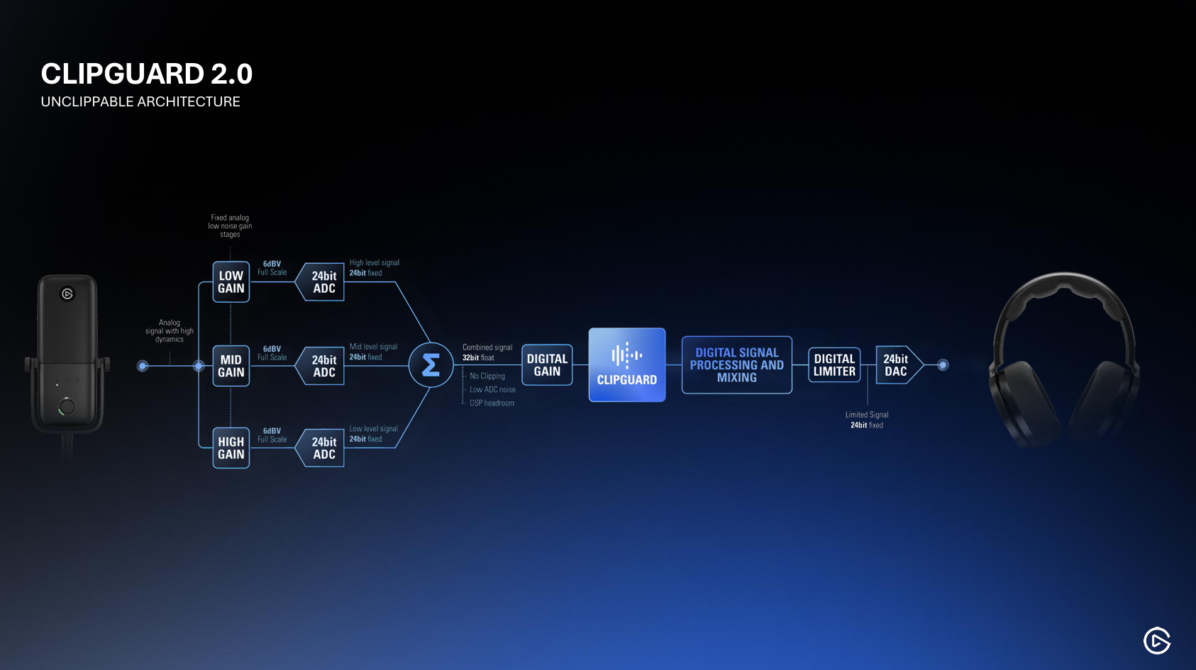 Während Elgato bei früheren Versionen bereits eine Clipguard-Engine hatte, wurde mit der zweiten Generation die Performance verbessert – vor allem in Kombination mit dem integrierten DSP. Clipguard 2.0 sorgt für: