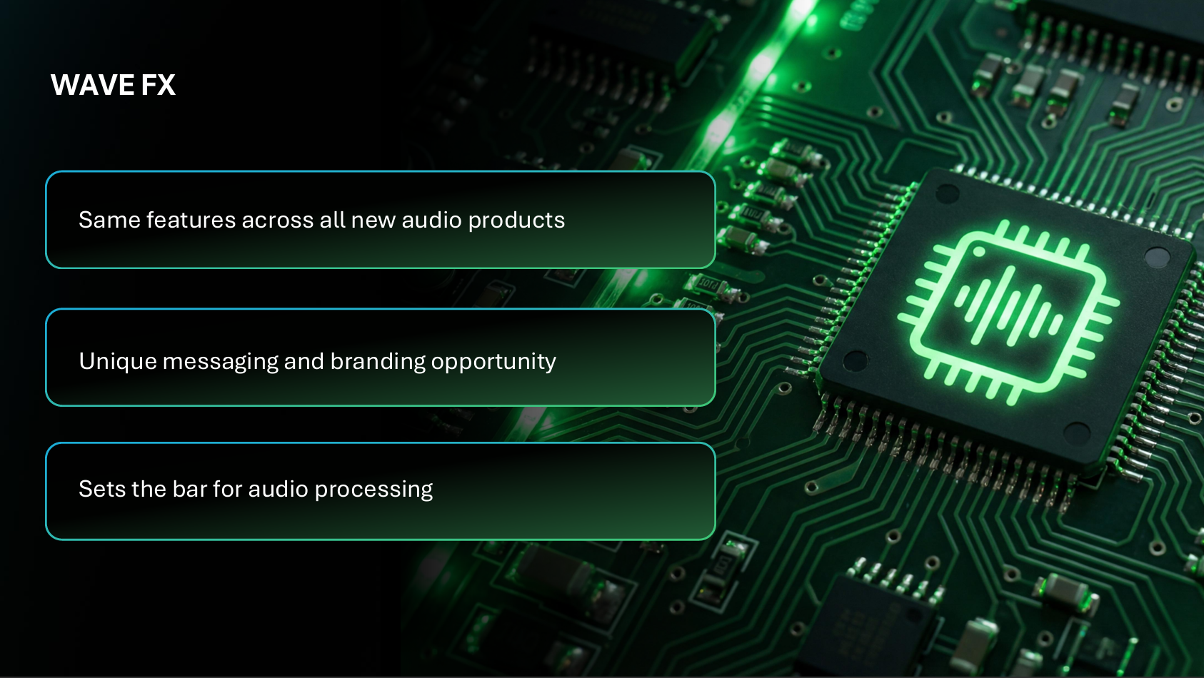 Der Wave FX Processor ist eine echte DSP-Engine (Digital Signal Processing) direkt im Interface. Statt die gesamte Effektverarbeitung auf den PC-Prozessor auszulagern, übernimmt der DSP selbst grundlegende Audio-Effekte und Berechnungen.