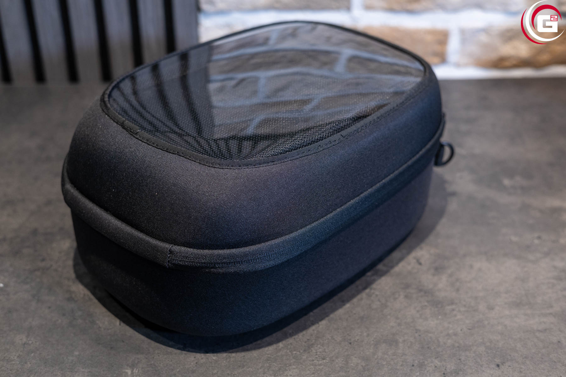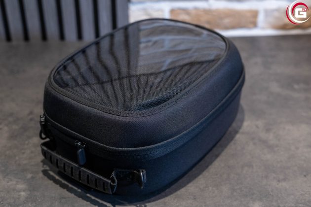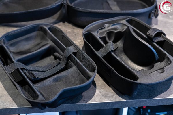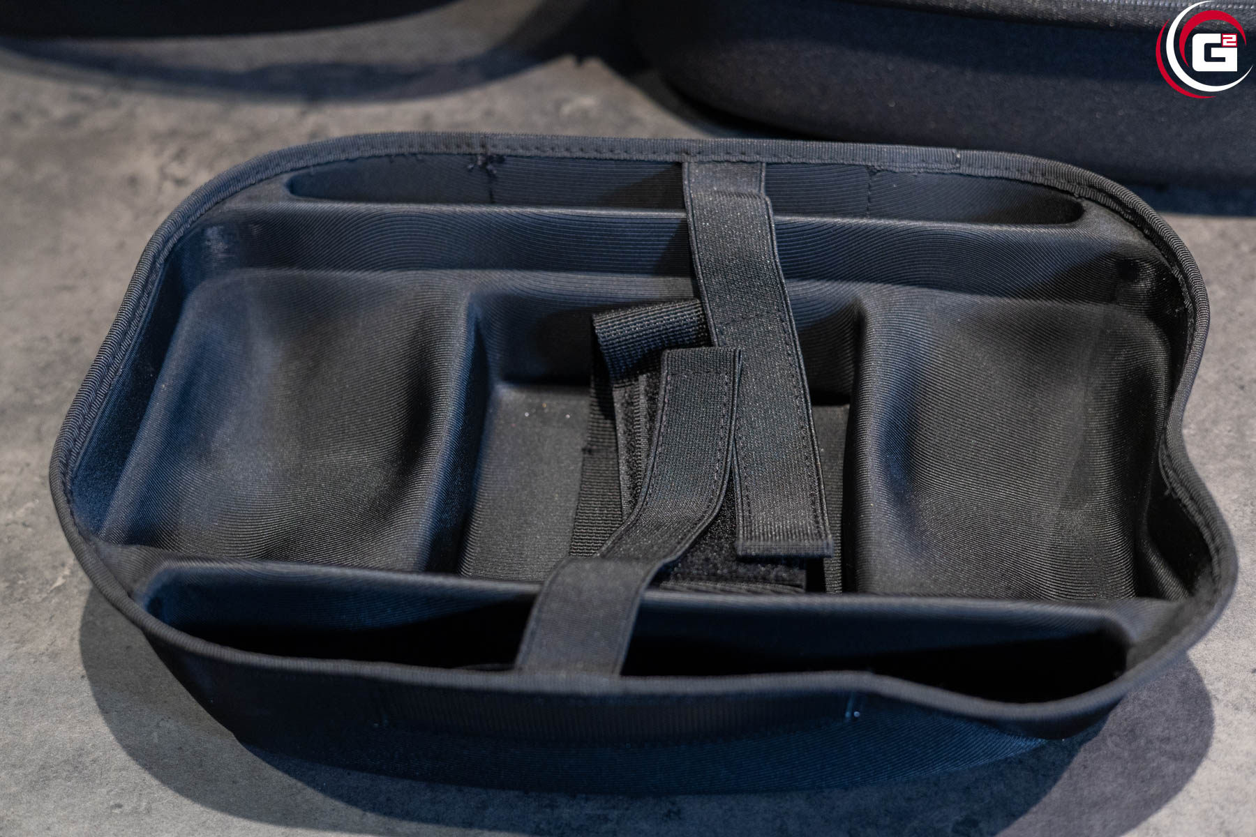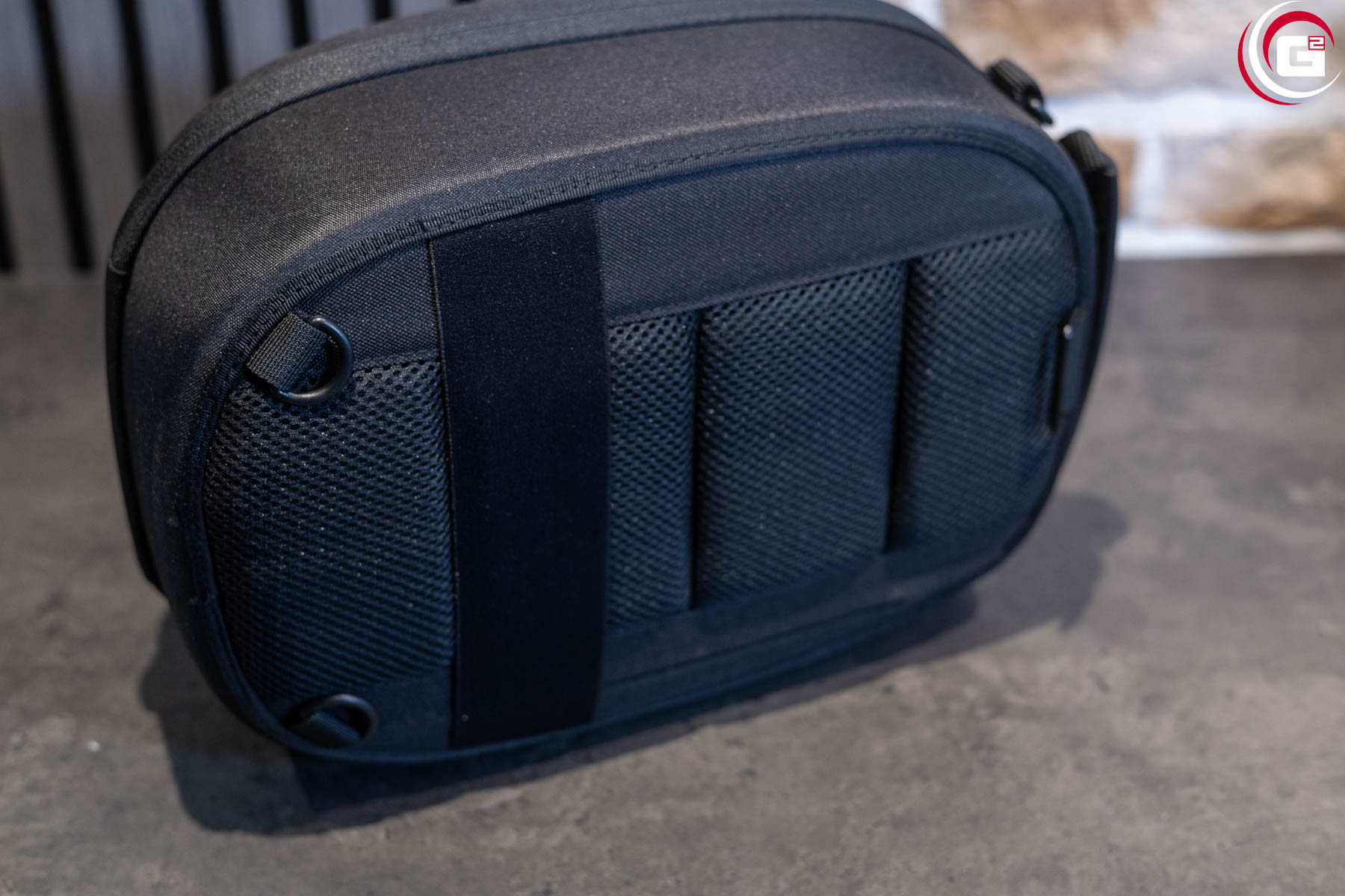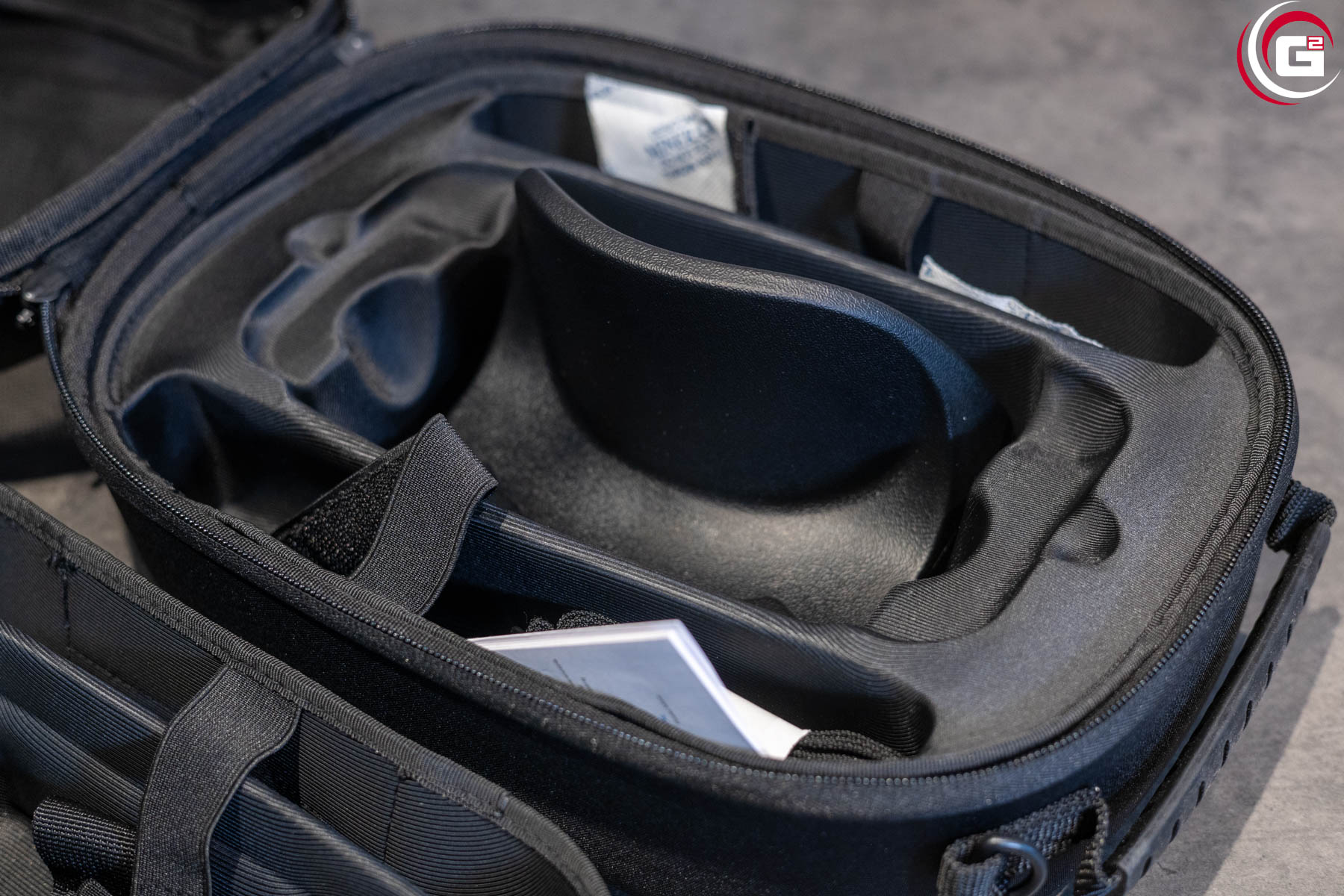 Ein wesentliches Merkmal ist das modulare Ordnungssystem. Zwei herausnehmbare, formbare Schaumstoffhalter ermöglichen es, Geräte passgenau zu fixieren. Dadurch kann der Innenraum je nach Nutzungsszenario angepasst werden: Mit eingesetzten Haltern wird ein sicherer Sitz für kompaktere Geräte erreicht, während durch deren Entfernung mehr Platz für größere VR-Headsets geschaffen wird, beispielsweise für Apple Vision Pro.