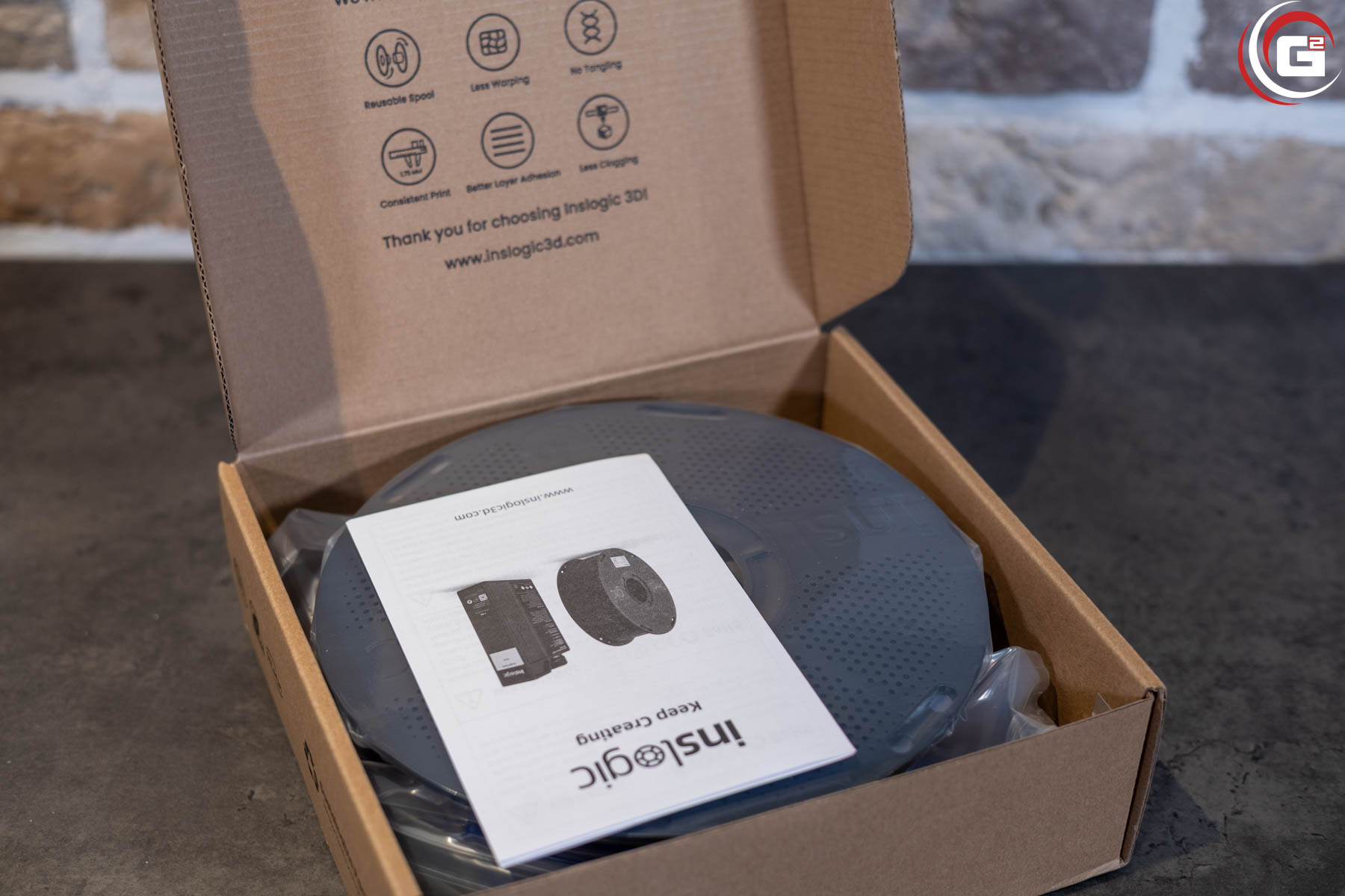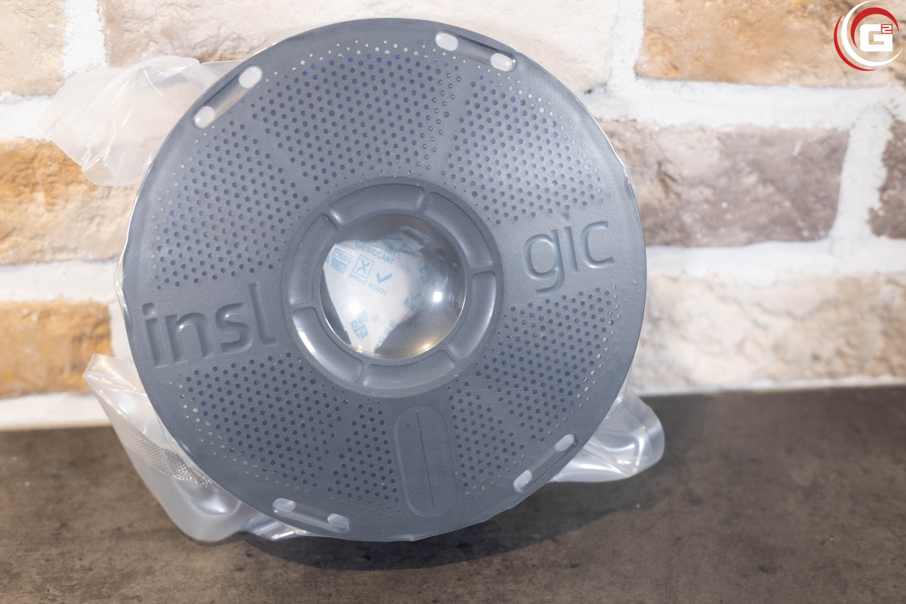Geliefert wird das INSLOGIC PLA Pro in einer naturfarbenen Kartonage, die lediglich in Schwarz bedruckt ist. Die Spule an sich ist in einem wiederverwendbaren Folienbeutel eingeschweißt, sodass sie beim Transport vor Feuchtigkeit gut geschützt ist.