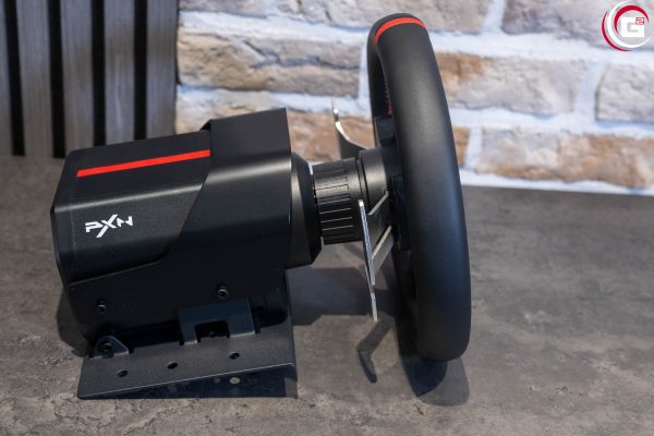 Der Antrieb des Lenkrads befindet sich in einem Gehäuse aus schwarzem Kunststoff. Dieses verfügt mit den abgeschrägten Ecken über eine sehr ansprechende Formgebung. An der Vorderseite kann mittels einer Überwurfmutter aus Kunststoff das Lenkrad befestigt werden und an der Rückseite finden sich diverse Anschlüsse für die Stromversorgung und Anbindung verschiedener Systemkomponenten. Da das Gehäuse selber keine Montagegewinde bietet, ist es mit einer Grundplatte aus Metall ausgestattet. Hier finden sich links und rechts je drei Bohrungen in einer Linie. Auf der Oberseite des Gehäuses findet sich eine rote Linie und seitlich ein „PXN“- bzw. „V10 Ultra“-Schriftzug.