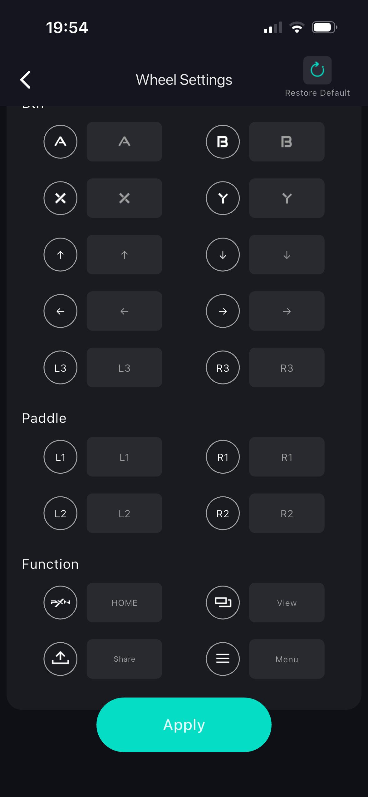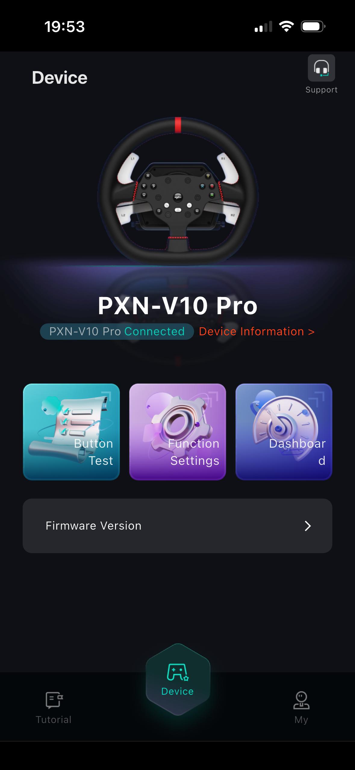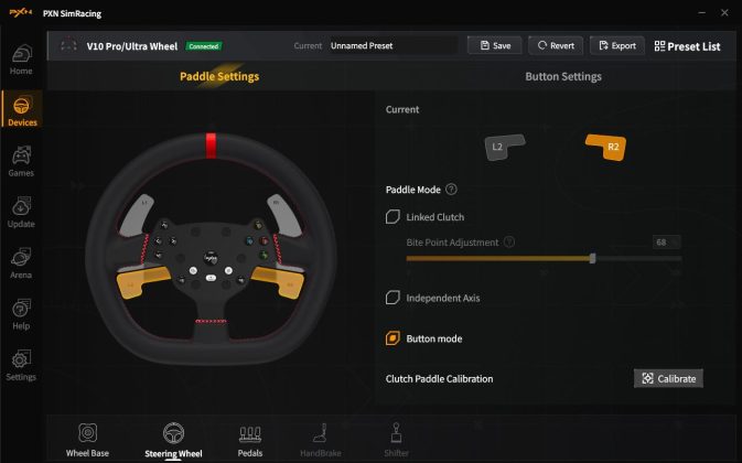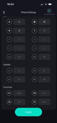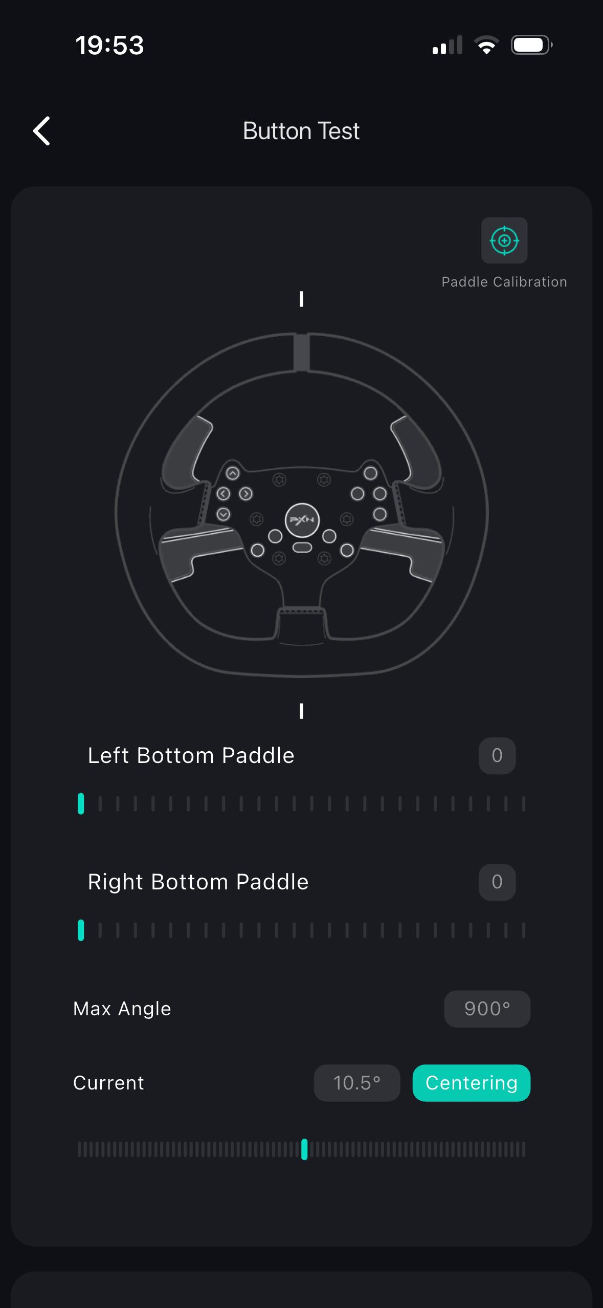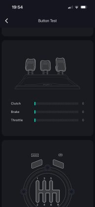 Erhältlich ist die App PXN Nexus sowohl für Android als auch für iOS, genutzt haben wir die iOS-Version. Über die App hat man Zugriff auf alle Konfigurationen und kann die Bedienelemente testen. Letzteres ist über die Schaltfläche „Button Test“ möglich. Hier kann man sich nicht nur anzeigen lassen, ob die Tastenbetätigungen richtig erkannt werden, sondern auch die Einschlagwinkel und Pedalbedienungen überprüfen. Zudem kann man hier auch die Mittelposition des Lenkrads nachkalibrieren.