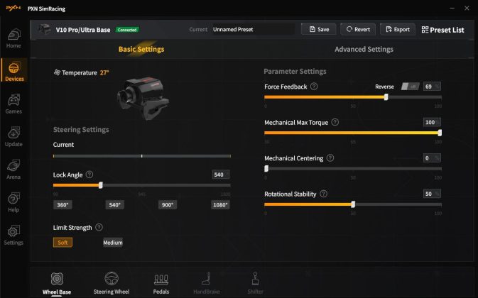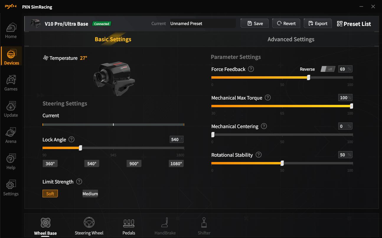 In allen Titeln zeigt sich ein angenehmes Lenkgefühl mit dem PXN V10 Ultra. Das Force-Feedback bietet einen spürbaren Widerstand, der so ausfällt, dass hier auch problemlos Kinder und Einsteigende loslegen können, ohne dass man große Beschränkungen hinterlegen muss. Das Gaspedal ist angenehm zu betätigen, jedoch ist die Bremse recht weich und besitzt einen langen Weg. Letzteres kann man mittels optimierter Profile reduzieren, um den Widerstand zu ändern, bräuchte man jedoch andere Federn, die noch nicht in Deutschland bestellbar sind. Allerdings muss man auch hier die Einstiegsfreundlichkeit im Auge behalten und diese ist mit der weicheren Bremse besser erfüllt. Denn die bei vielen professionellen Systemen vorherrschenden hohen Widerstände eignen sich nicht für die Beine von Kindern.