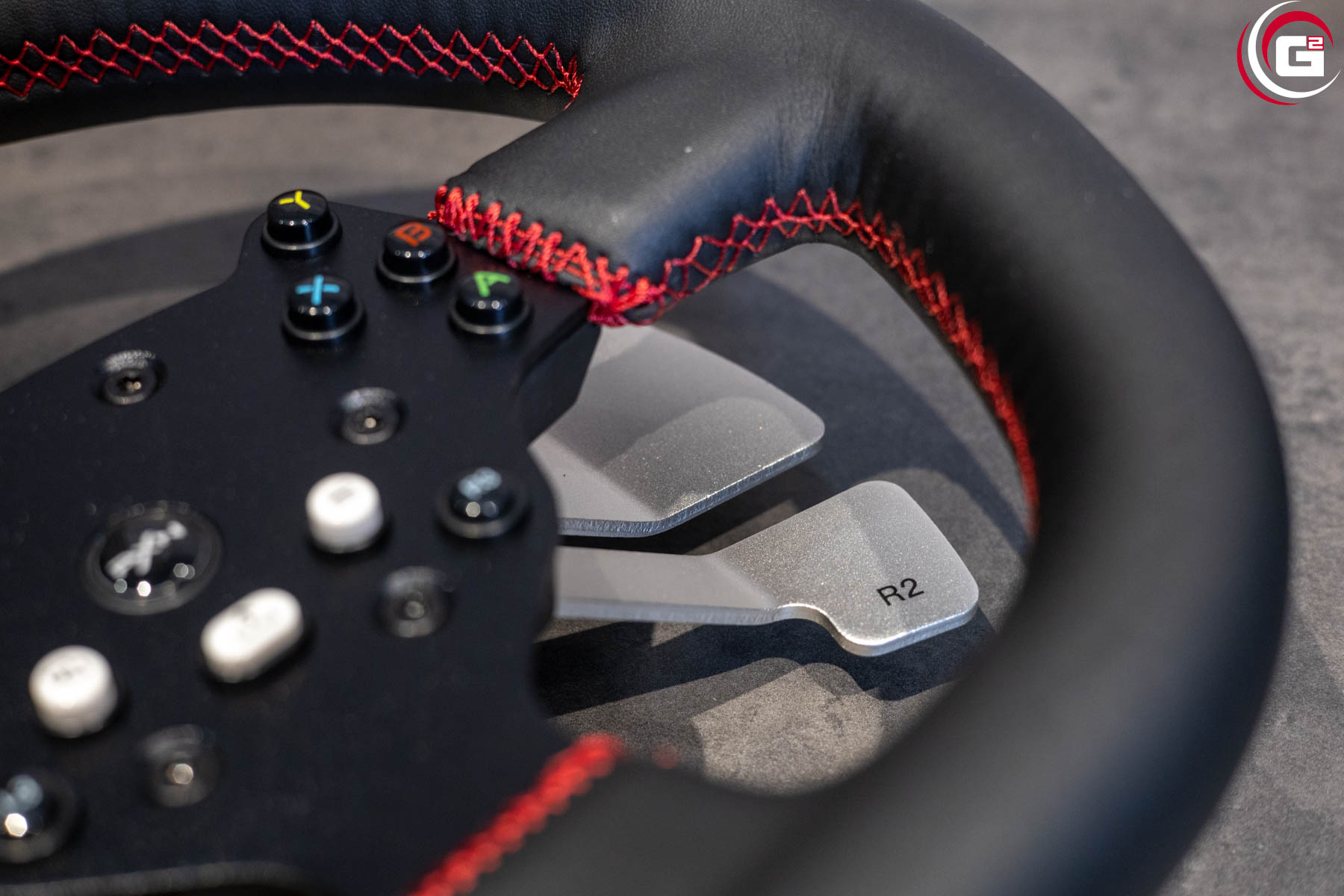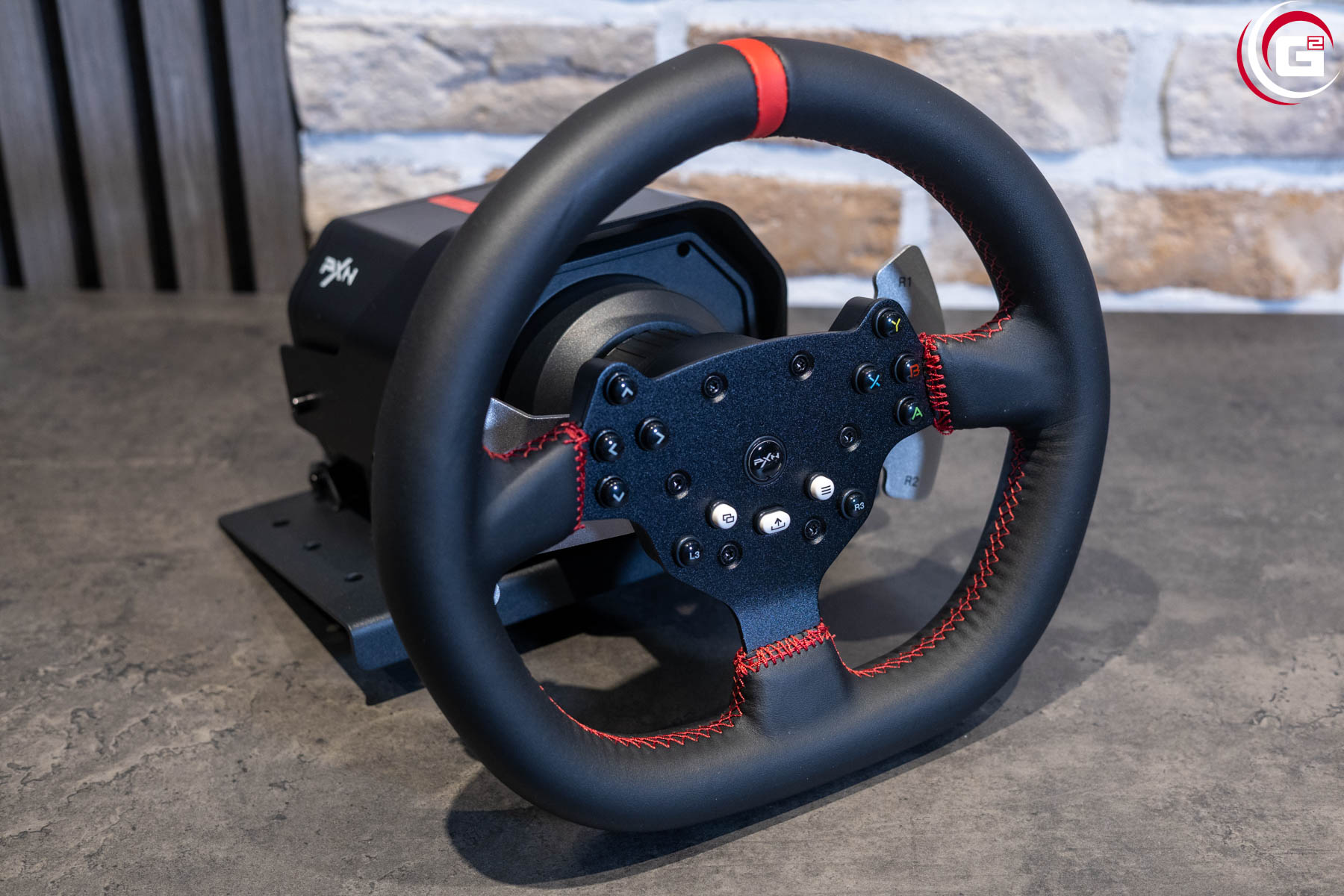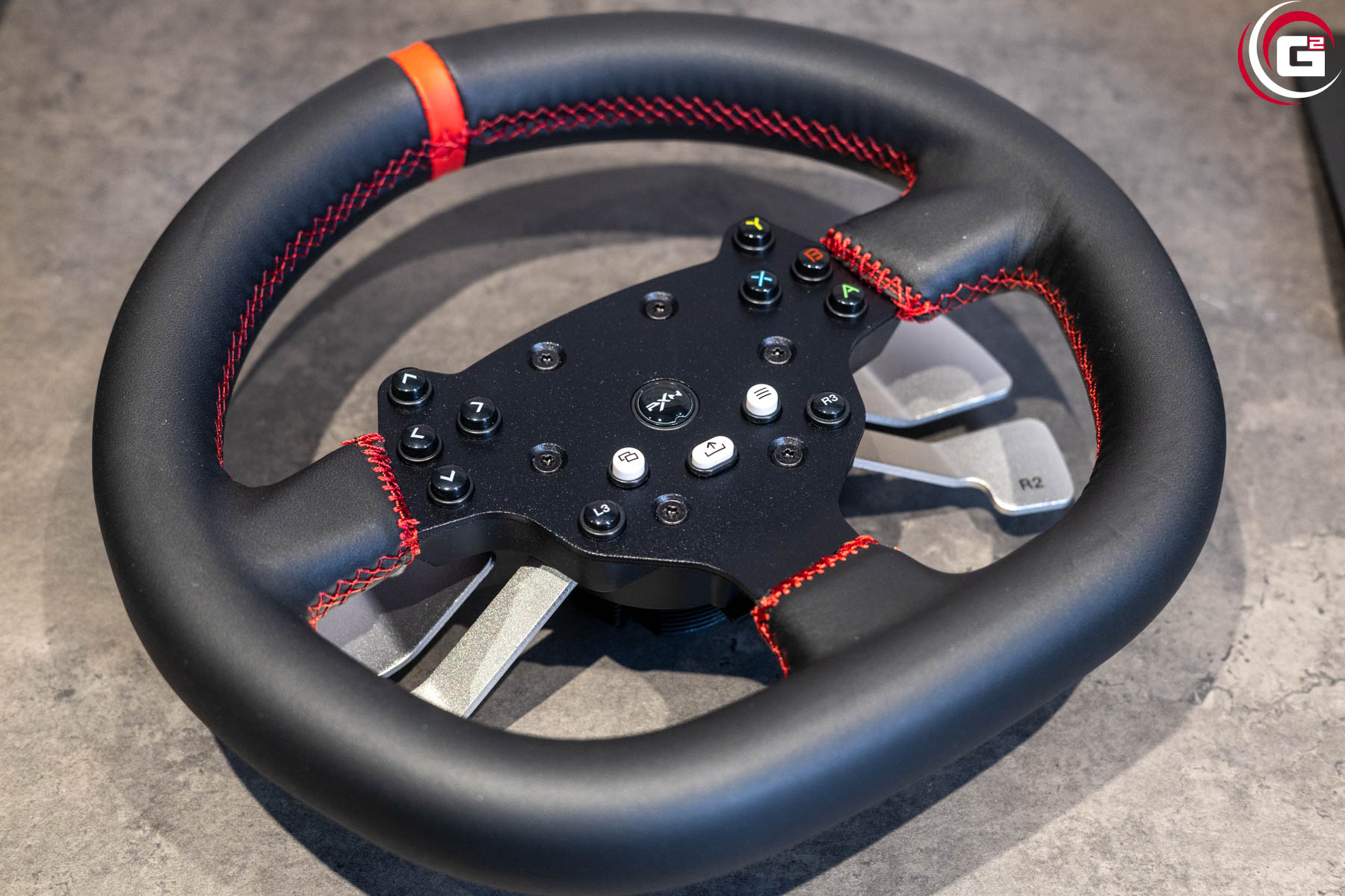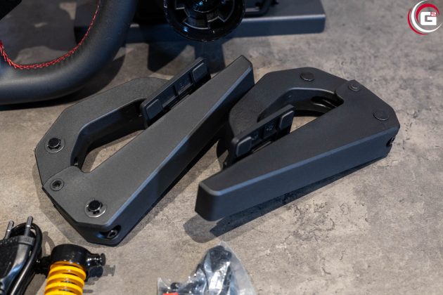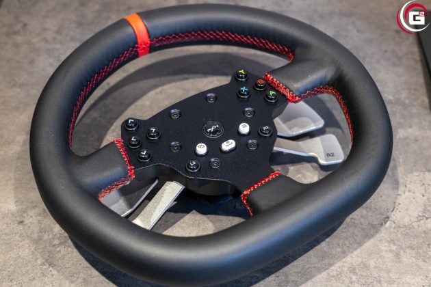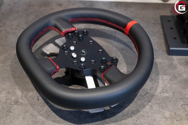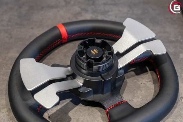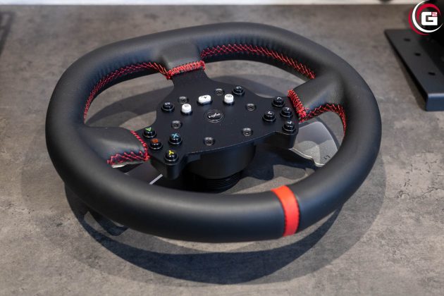 Farblich ist das Lenkrad perfekt auf die Basis abgestimmt. Mit einem Durchmesser von 270 Millimetern fällt es insgesamt recht kompakt aus. In der Mitte befindet sich die Button-Box mit einer schwarzen Metallgrundplatte. Der Lenkradkranz besitzt einen Kunstlederüberzug mit rot abgesetzten Nähten. Oben befindet sich genau in der Mitte ein roter Kunstlederstreifen. Rückseitig sind an der Button-Box je Seite zwei Schaltwippen aus eloxiertem Aluminium angebracht. Mittig findet sich noch ein Formelement aus Kunststoff, das zur Ausrichtung des Lenkrads an der Basis dient. Es ist mit einem Außengewinde versehen, um das Lenkrad mit der Überwurfmutter fest mit der Basis zu verbinden. Aktuell gibt es allerdings keine Austauschlenkräder für diesen Anschluss.