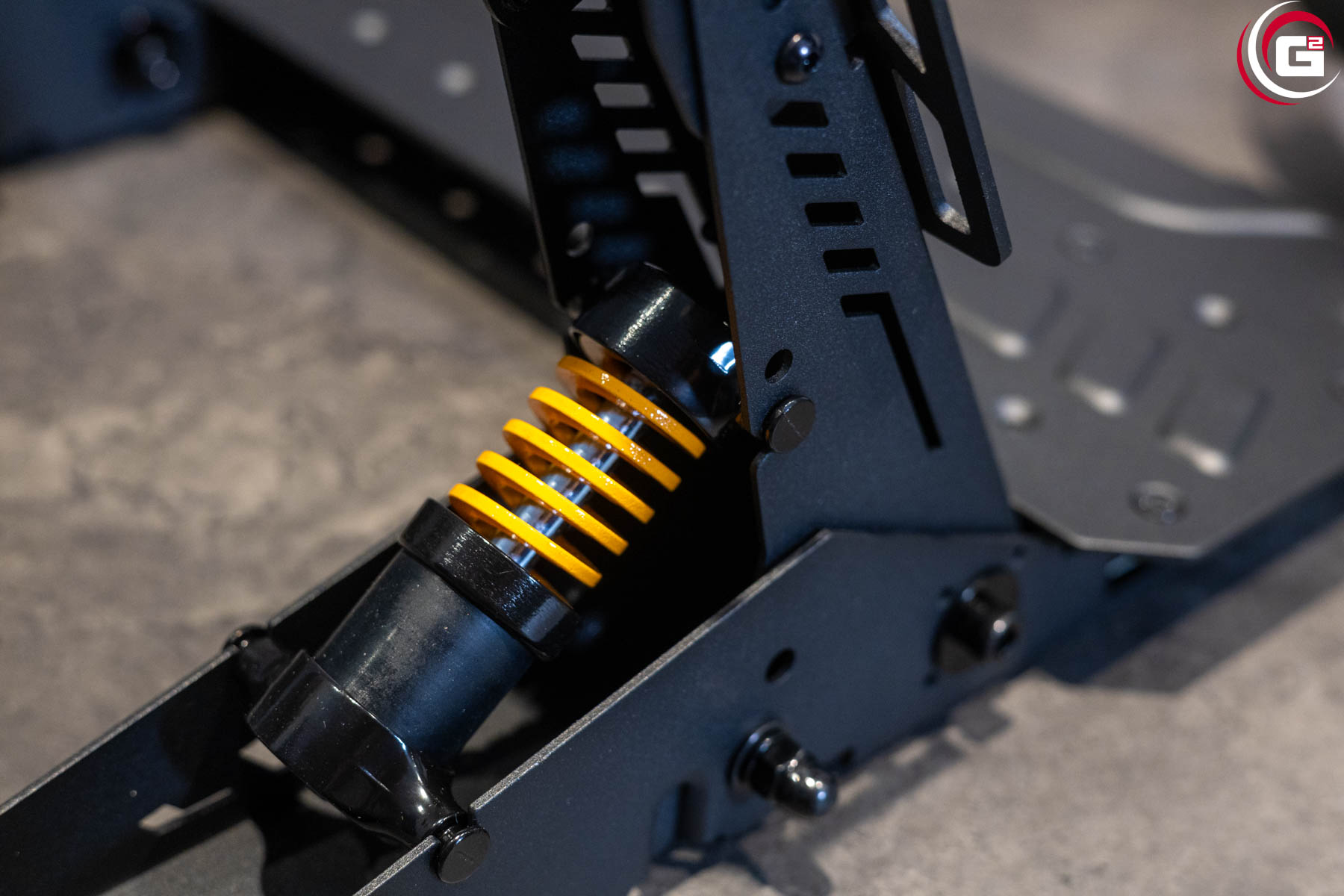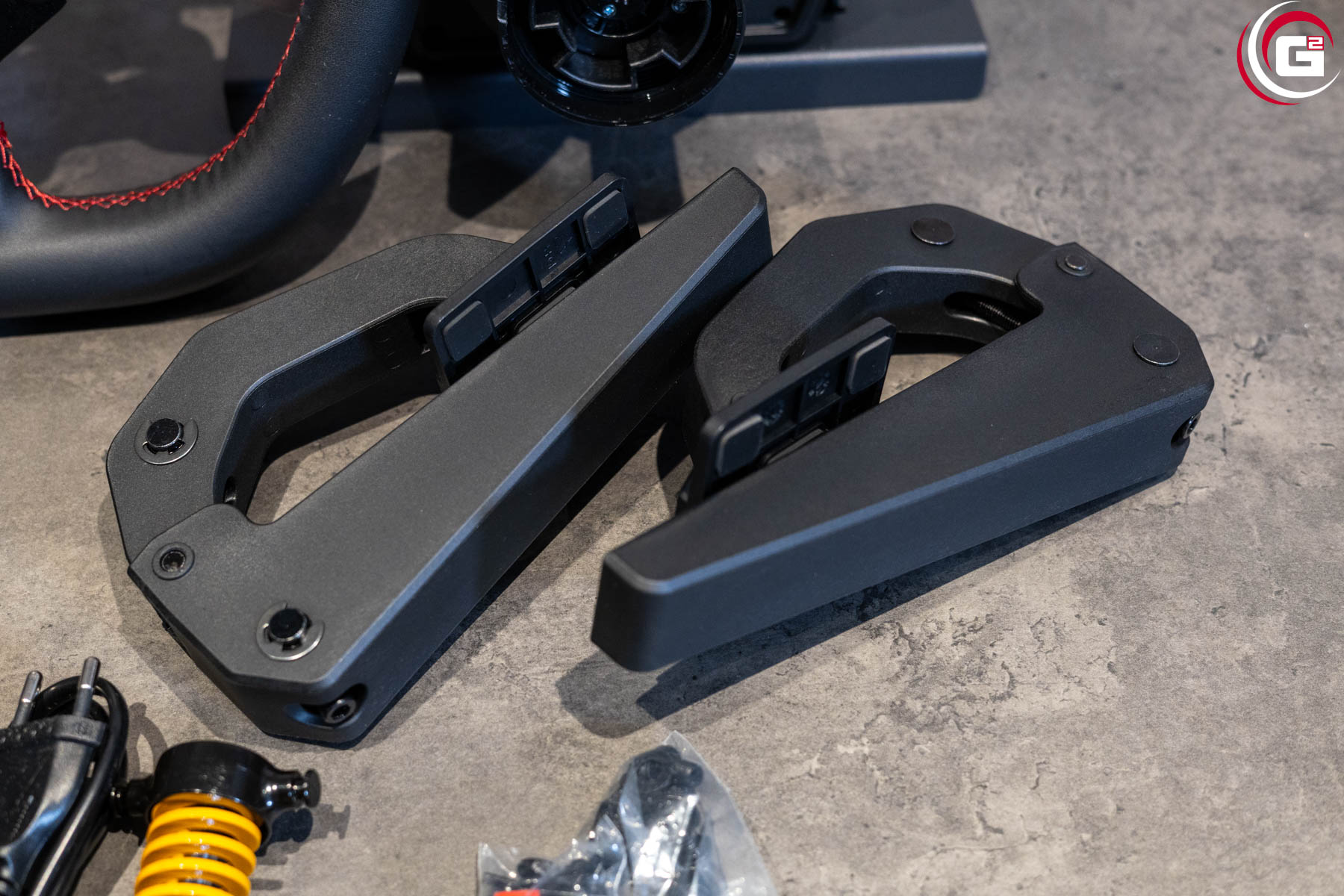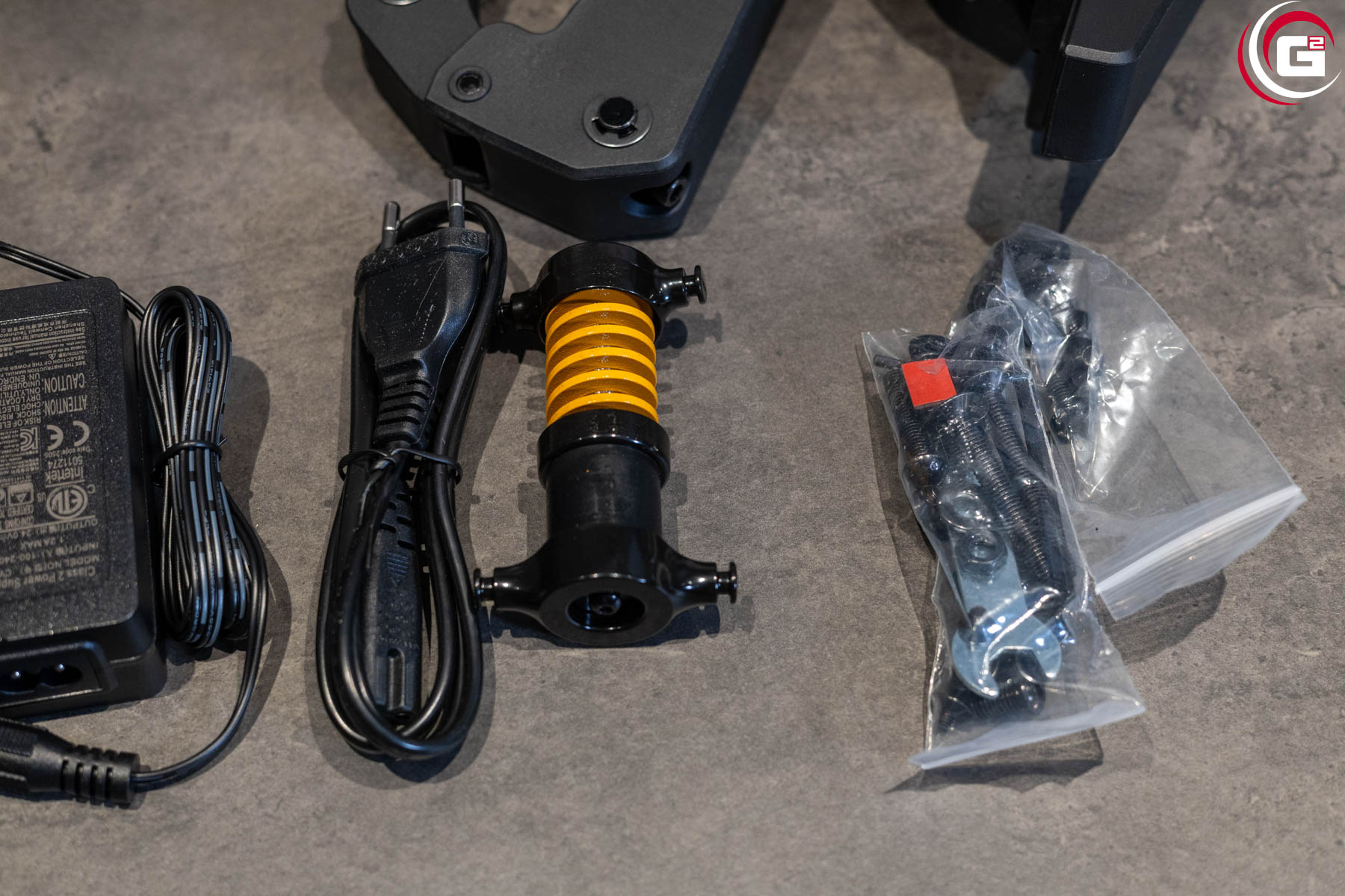 Aufgrund des nicht ganz so hohen Drehmoments des Motors fällt der Stromverbrauch moderat aus und es bedarf nur eines kleinen externen Netzteils. Der Federdämpfer des Bremspedals besitzt eine gelb lackierte Feder, ein Zeichen dafür, dass hier noch andere Federn folgen werden. Die beiliegenden Tischklemmen sind großzügig dimensioniert und auch die Kabel verfügen über eine angemessene Isolierung.