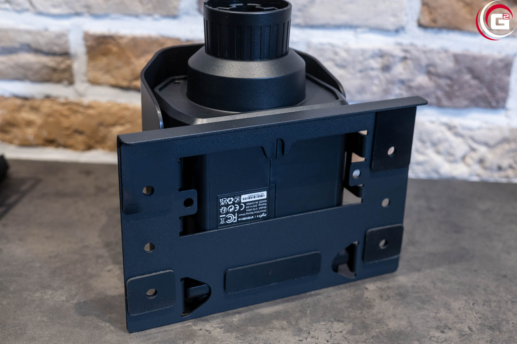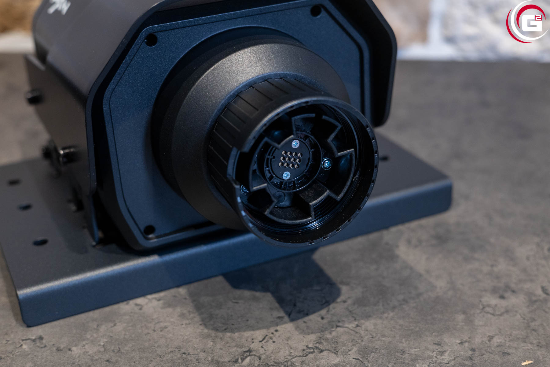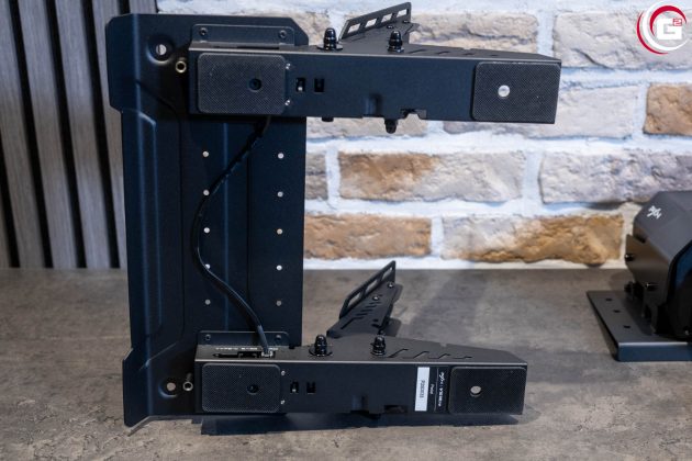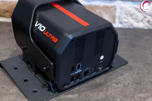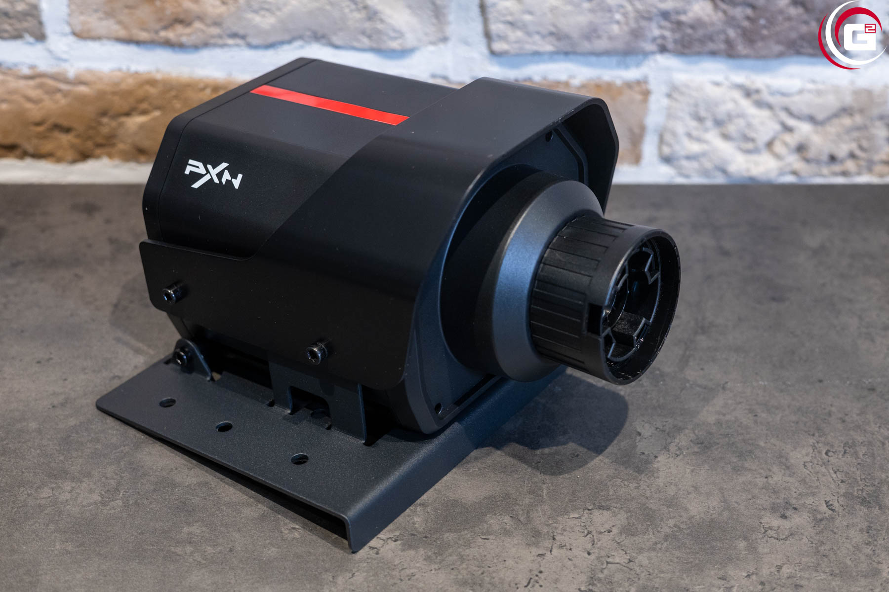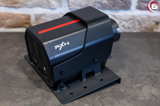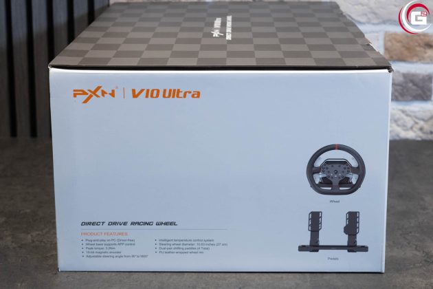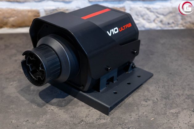 Der Antrieb des Lenkrads befindet sich in einem Gehäuse aus schwarzem Kunststoff. Dieses verfügt mit den abgeschrägten Ecken über eine sehr ansprechende Formgebung. An der Vorderseite kann mittels einer Überwurfmutter aus Kunststoff das Lenkrad befestigt werden und an der Rückseite finden sich diverse Anschlüsse für die Stromversorgung und Anbindung verschiedener Systemkomponenten. Da das Gehäuse selber keine Montagegewinde bietet, ist es mit einer Grundplatte aus Metall ausgestattet. Hier finden sich links und rechts je drei Bohrungen in einer Linie. Auf der Oberseite des Gehäuses findet sich eine rote Linie und seitlich ein „PXN“- bzw. „V10 Ultra“-Schriftzug.