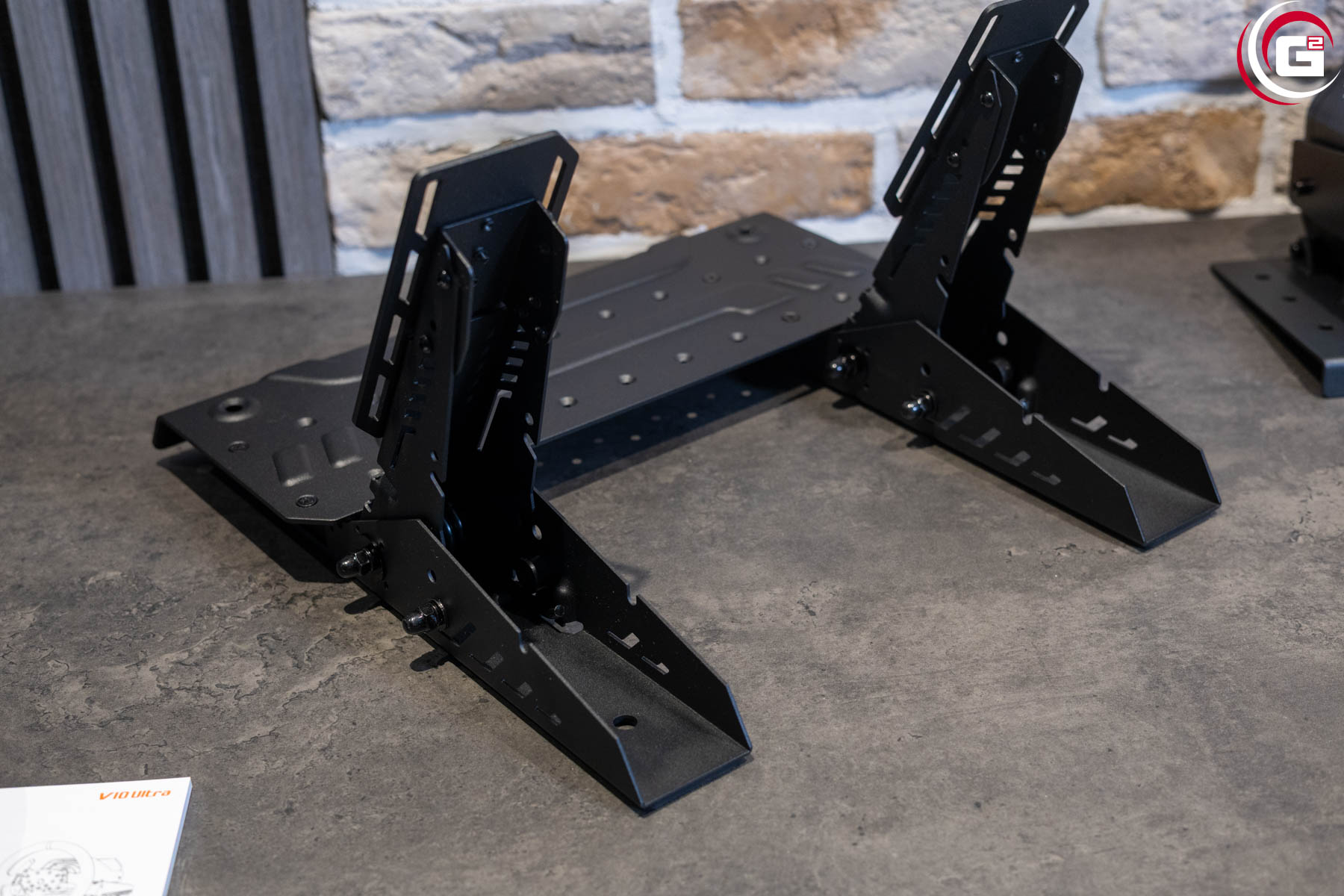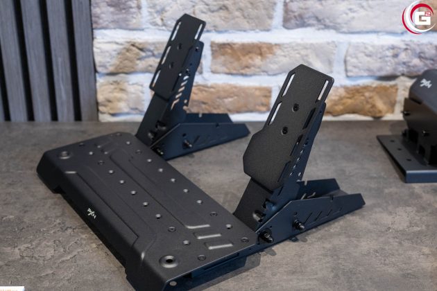 Bei der Pedalerie kommt überwiegend Metall mit schwarzer Pulverbeschichtung zum Einsatz. Gas- und Bremspedal bilden für sich eine Einheit und sind mit einer Platte, die gleichzeitig als Fußauflage dient, verbunden. Für die Verschraubung am Rig gibt es Bohrungen an den Grundprofilen der Pedaleinheiten, aber auch an der Fußauflage. Alle wichtigen Anschlüsse finden sich am Bremspedal, die Federeinheit (austauschbar, aber noch nicht im Shop gelistet) wird nachträglich montiert. Prinzipiell kann man die Abstände der Pedale auch individuell ändern. Bereits ab Werk sind Gas- und Bremspedal mit einem RJ11-Kabel verbunden. Auch der Anstellwinkel der Pedale kann angepasst werden, ebenso die Höhe der Fußplatte.