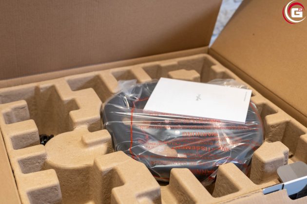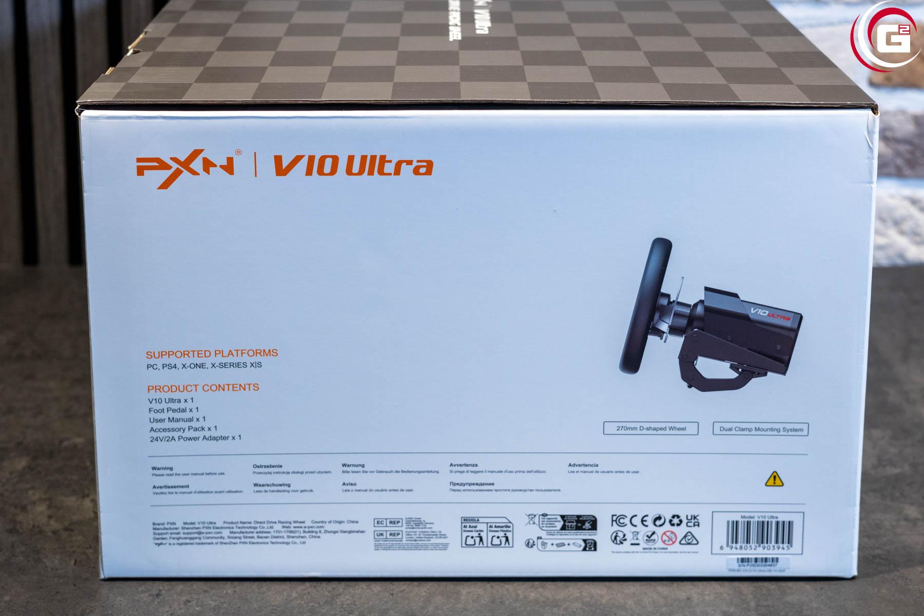 Geliefert wird das PXN V10 Ultra in einer voluminösen Umverpackung, schließlich muss hier das gesamte Set Platz finden. Die Oberseite bietet mit einem Carbonmuster einen schönen Kontrast zu den weißen Seitenflächen. Auf der Vorderseite finden wir eine Produktabbildung und rechts sowie links weitere Darstellungen und Detailangaben.