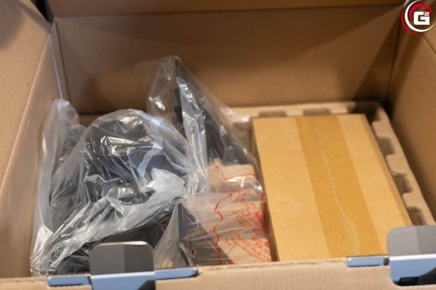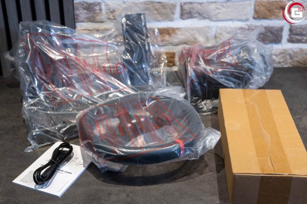 Im Inneren finden sich die einzelnen Komponenten des Sets geschützt in Folienbeuteln sicher in einer Formkartonage verstaut. Der Lieferumfang besteht neben der Basis, der Pedalerie und dem Lenkrad noch aus zwei Tischklemmen, Schrauben und diversen USB-Kabeln für die Verbindung untereinander und mit dem PC.