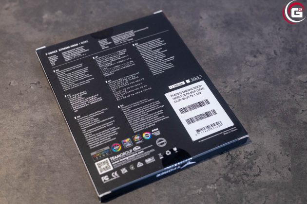 Das RAM-Kit TEAMGROUP T-FORCE XTREEM ARGB DDR5 6000 MHz wird in einer flachen Kartonage geliefert, die im typischen TEAMGROUP-Design gehalten ist. Auf der Vorderseite findet sich eine Abbildung der RAM-Riegel samt Beleuchtungseffekt und auf der Rückseite werden einige technische Details und Features aufgelistet. Die Riegel selbst sind im inneren durch einen Kunststoffblister geschützt.
