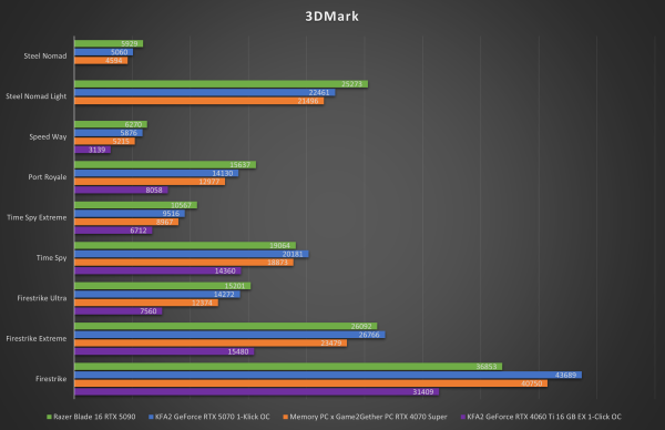 Die durchgeführten GPU-Tests zeichnen ein insgesamt konsistentes Bild der Leistungsfähigkeit der mobilen GeForce RTX 5090 im Razer Blade 16. In den synthetischen Benchmarks von 3DMark zeigt sich insbesondere in den moderneren Tests mit DirectX 12 und Raytracing-Unterstützung eine sehr hohe Performance, während die Ergebnisse in älteren DirectX-11-Benchmarks etwas geringer ausfallen. Im Vergleich zu Desktop-Grafikkarten positioniert sich die mobile RTX 5090 dabei häufig auf oder leicht oberhalb des Niveaus einer Desktop-GeForce RTX 5070, wobei der Abstand je nach Benchmark und genutzten Features variiert.