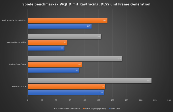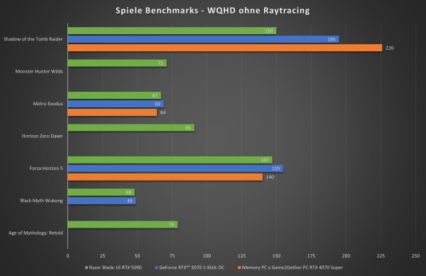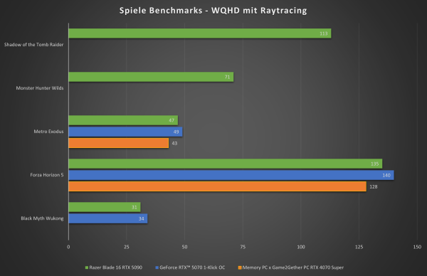 Ein ähnliches Bild ergibt sich in den praxisnahen Spiele-Benchmarks. In WQHD-Auflösung und bei deaktiviertem Raytracing erreicht die mobile RTX 5090 durchweg Bildraten, die mit einer Desktop-RTX 5070 vergleichbar sind. Auch mit aktiviertem Raytracing bleibt die Leistungsdifferenz zwischen beiden Lösungen gering, was die Effizienz der Blackwell-Architektur unterstreicht. Besonders deutlich fällt der Leistungszuwachs in Szenarien aus, die KI-gestützte Funktionen wie Frame Generation nutzen, wodurch in unterstützten Titeln ein spürbarer Anstieg der Bildrate erzielt werden kann.