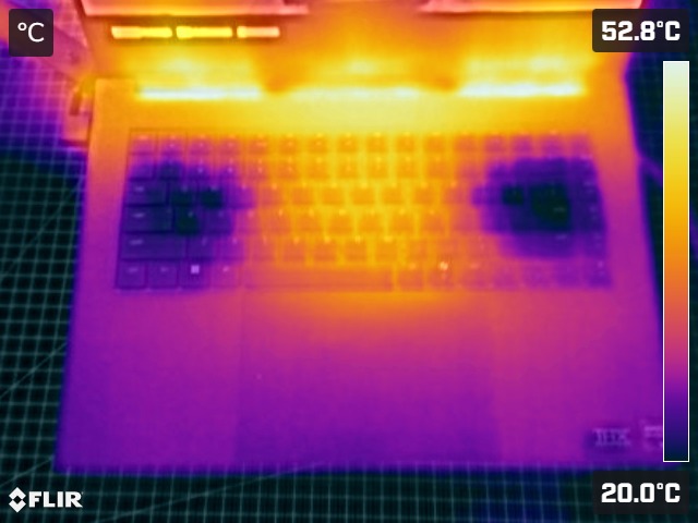 Sehr interessant bei einem Notebook ist natürlich auch immer die Wärmeverteilung unter Volllast. Dazu boten unsere Benchmarks natürlich einige Gelegenheiten. Um diese Verteilung etwas besser dazustellen haben wir ein IR-Bild aufgenommen.