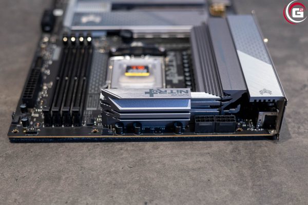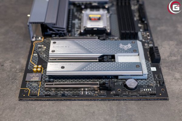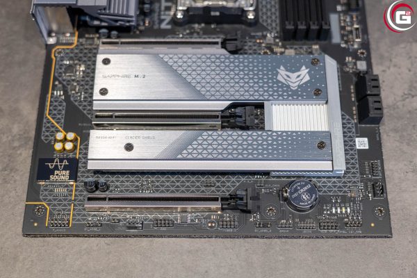 Angeordnet sind die NVMe-SSD-Slots zwischen den Erweiterungssteckplätzen. Jeder Steckplatz verfügt über einen Kühlkörper samt Wärmeleitpad.