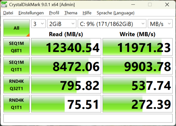 Mit Blick auf die Schnittstellen des SAPPHIRE NITRO+ B850A WIFI 7 interessiert uns vor allem, ob bei der SSD und auch bei den USB-Schnittstellen die angegebenen Datenraten erreicht werden. Hierzu haben wir auf die Software CrystalDiskMark zurückgegriffen.