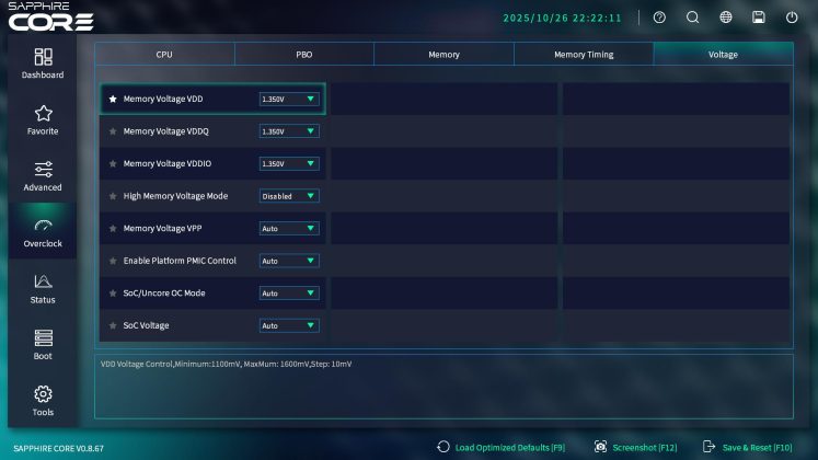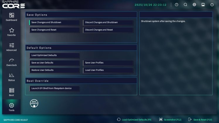 Zur Ansteuerung und Konfiguration des SAPPHIRE NITRO+ B850A WIFI 7 kommt ein UEFI im Sapphire-Design zum Einsatz. Es besitzt eine moderne, aufgeräumte Optik, die teils einen eigenen Weg geht. Zum Zeitpunkt des Tests war die Version AM50N101R23 vom 01.09.2025 aktuell.