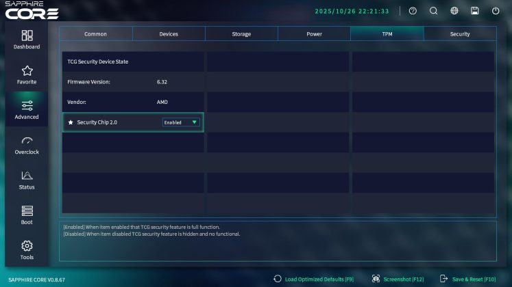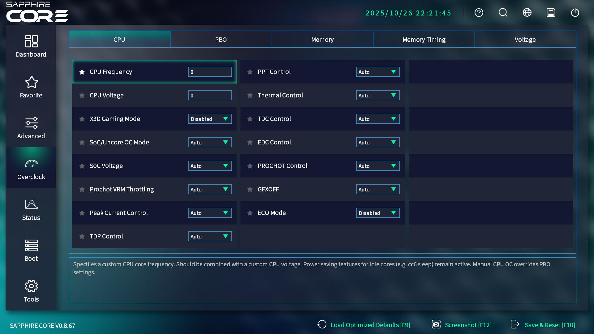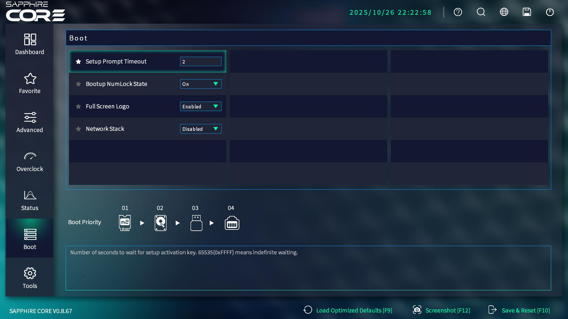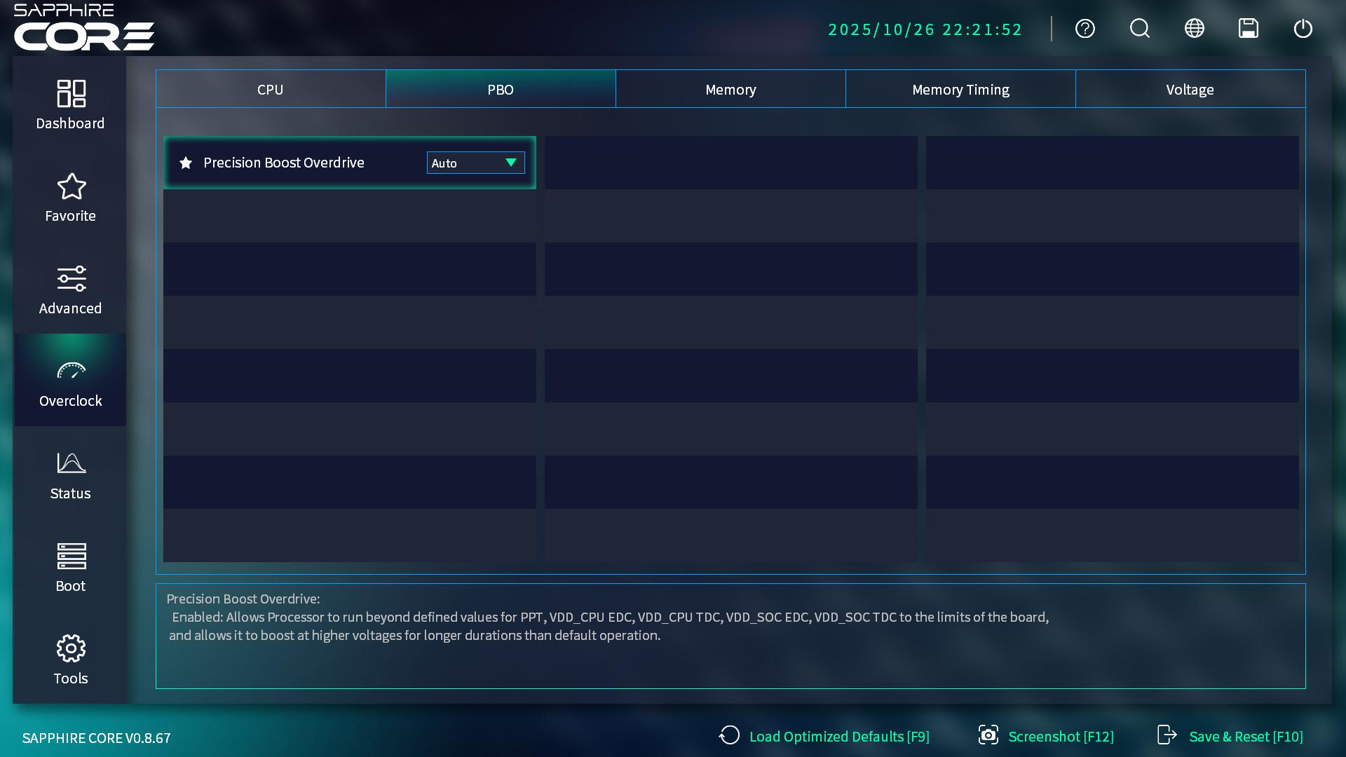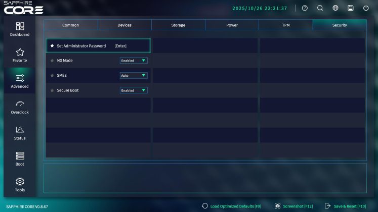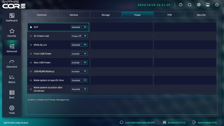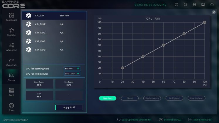 Das SAPPHIRE CORE BIOS verfügt über eine strukturierte Benutzeroberfläche für Overclocking, Sicherheits- und Systemeinstellungen. Es erlaubt die Speicherung von Profilen, bietet Hardwareüberwachung, Anpassung der Boot-Reihenfolge und eine integrierte Diagnoseoberfläche.