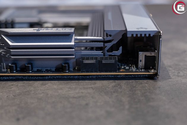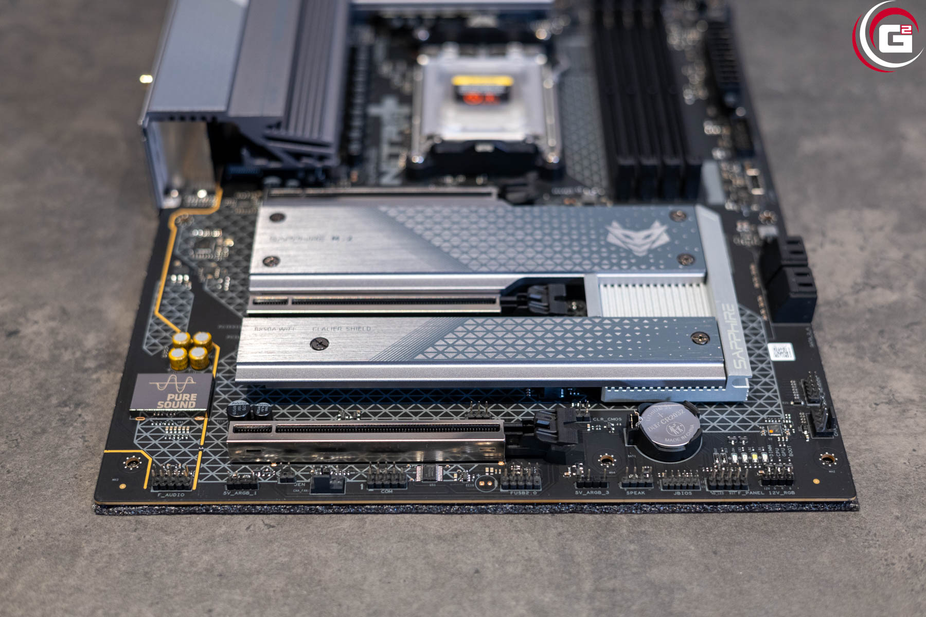 Mit vier NVMe-SSD-Steckplätzen ist eine großzügige Speichererweiterung möglich, auch wenn man berücksichtigen sollte, dass der zweite Slot die Grafikkarte beeinflusst. Die Spannungswandler samt Kühlung sowie die Phasenaufteilung bieten eine sehr gute Grundlage, auch für CPUs, wie den Ryzen 9 9950X3D. Etwas großzügiger ausfallen könnten jedoch die Kühlkörper für die PCIe-Gen5-SSD-Slots. Praktischerweise sind diese jedoch so gebaut, dass man hier auch gut SSDs mit Kühlkörper verbauen könnte.
