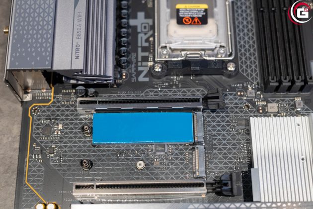 Beim SAPPHIRE NITRO+ B850A WIFI 7 sind ATX-typisch alle Komponenten und Anschlüsse in den meisten Gehäusen gut zugänglich. Für den Test haben wir SSD, RAM, CPU und CPU-Kühlerrahmen im Vorfeld montiert. Insbesondere die SSD im oberen Slot sollte man vor der GPU montieren, da dieser Slot (wie üblich) später von der GPU verdeckt wird. Der obere SSD-Slot verfügt neben dem Wärmeleitpad am Kühlkörper auch über ein Wärmeleitpad auf dem PCB des Mainboards. Fixiert werden die SSDs mittels kleiner Drehhaken.